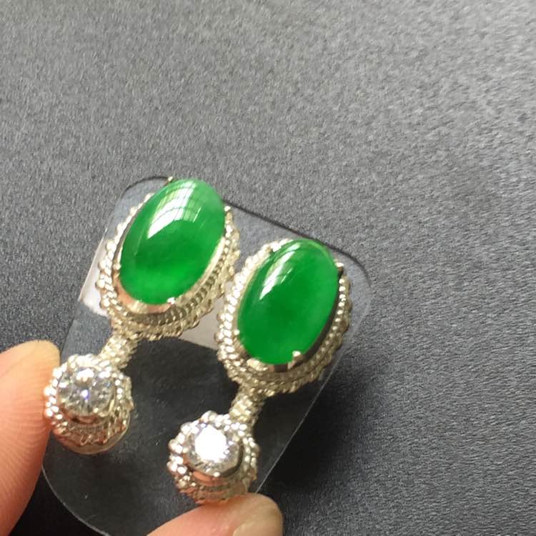 冰阳绿耳钉一对。完美饱满,种老色阳。真金真钻镶嵌。尺寸:9.7-8-6.6。:5500