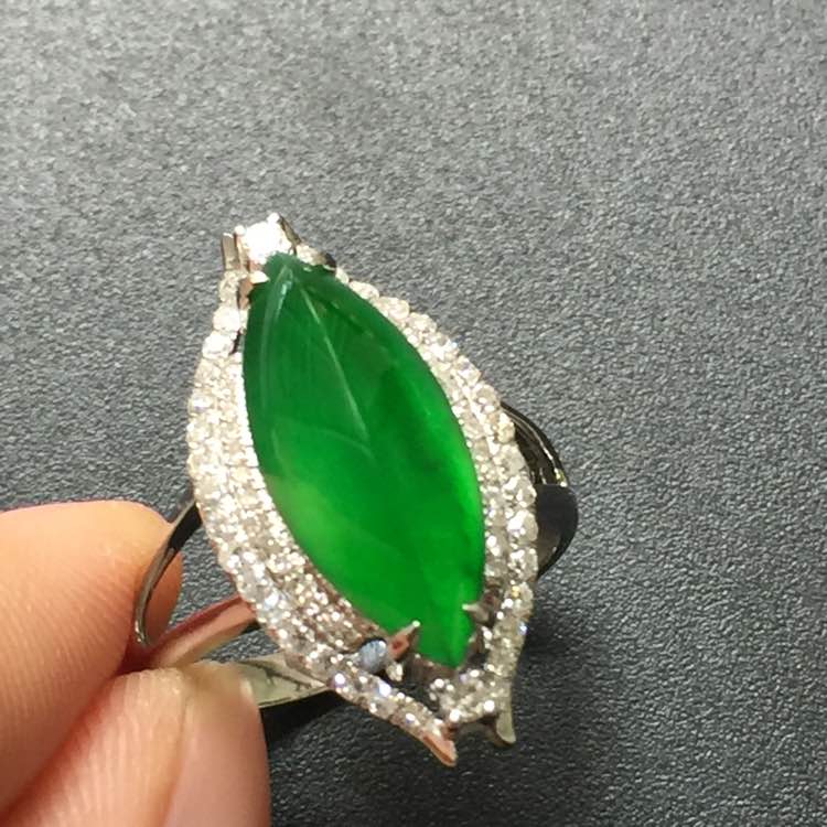 冰阳绿满色马眼戒指。真金真钻豪华镶嵌。完美饱满,种老色阳。裸石:18-7.5-4.4。:29800