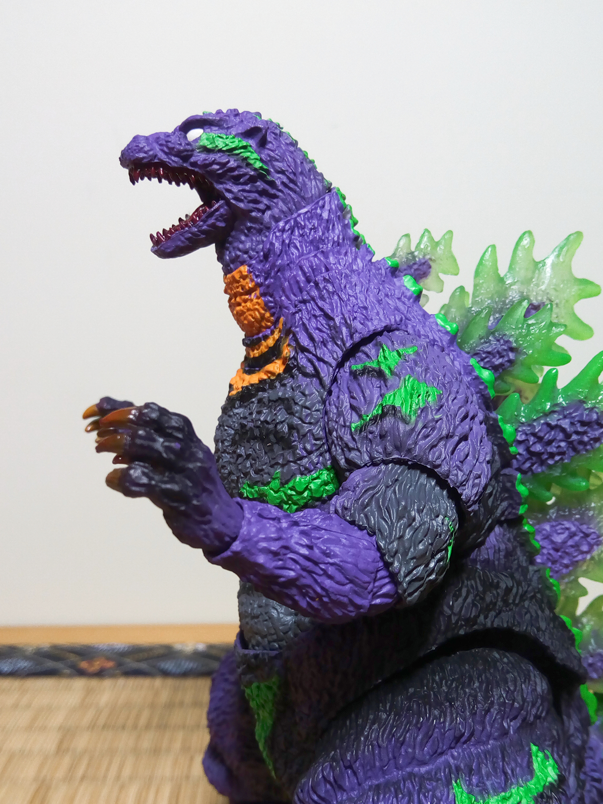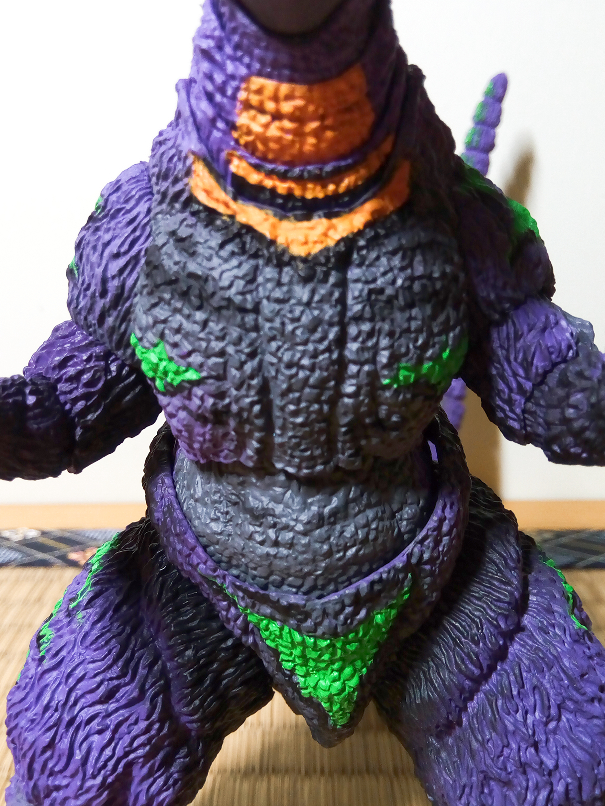 全身的绿色条纹以及些许黑色轮廓使得原本就相当野性的哥斯拉变得更加凶猛。与其说像初号机,个人觉得更像是一位土著部落的勇猛战士。