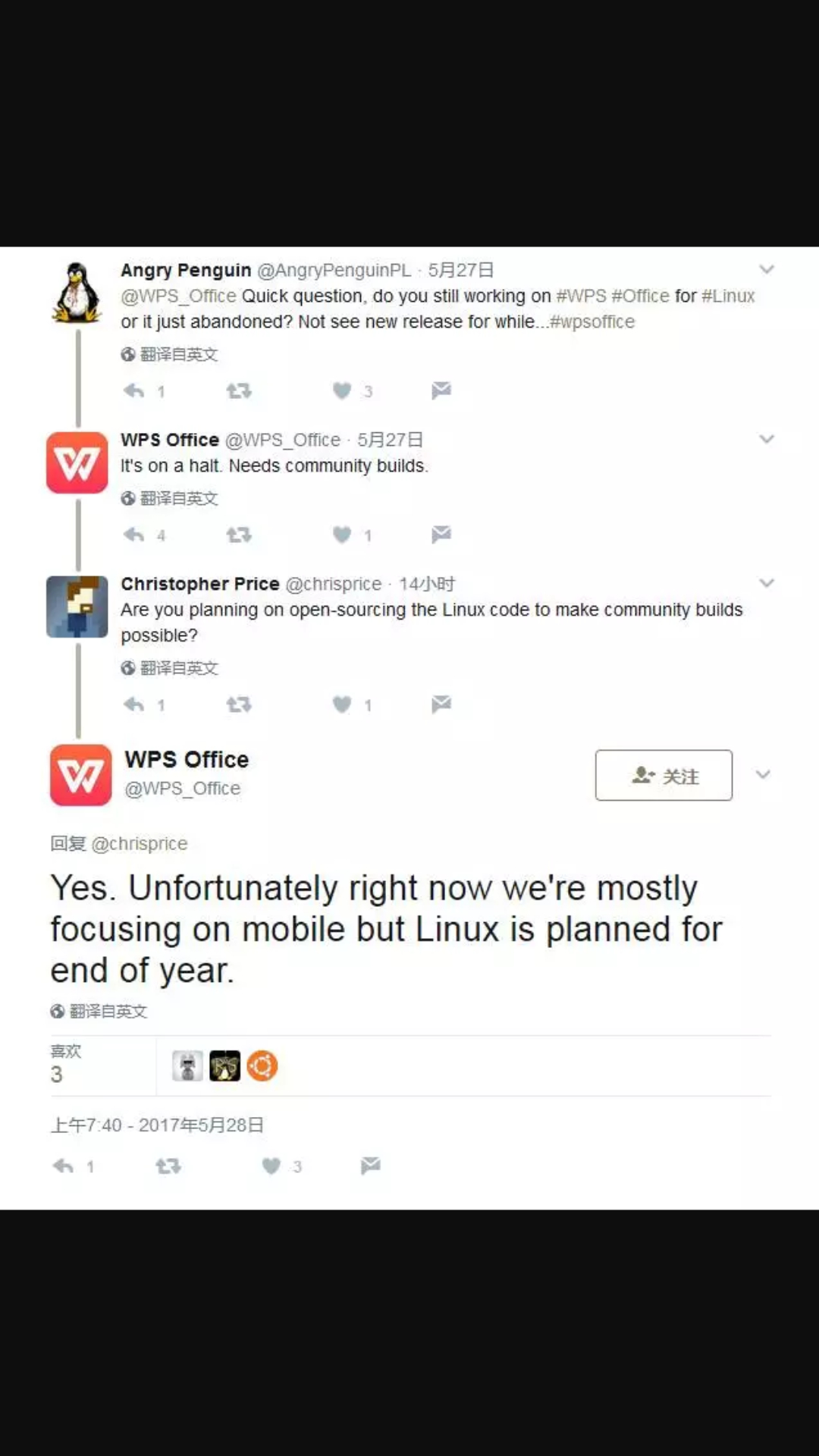 WPS Office for Linux最近一次更新是在一年前,目前最新的Linux版本号为WPS Office v1.0.5672 Alpha版本。为此近日,有用户在社交媒体Twitter上咨询团队是否依然致力于Linux版本的开发工作,而得到的回应是Linux版本目前已经处于悬停状态,并表示需要社区版本。