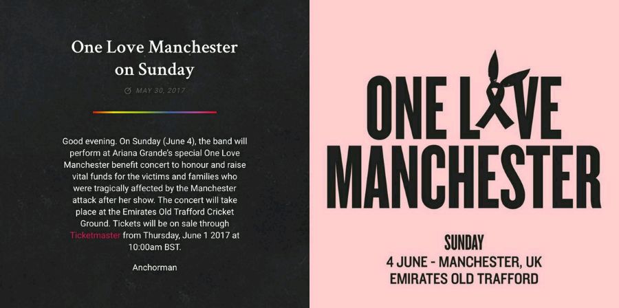 6月4日,酷玩将参加Ariana Grande在曼彻斯特举行的慈善筹款义演!以悼念、慰问在恐袭中的受害者及其家属。完整表演嘉宾名单已公布,除了A妹外,Katy Perry、Justin Bieber、Coldplay、Miley Cyrus、Pharrel Williams、Usher、Take That和Niall Horan也将表演,之前参加过曼彻斯特演唱会的观众和歌迷将免费观看本次义演。义演善款将全部捐给We Love Manchester紧急基金会。据悉,现场能容纳5万名观众。