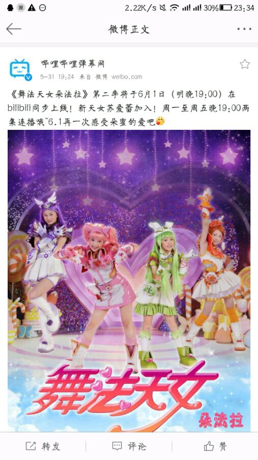 [cp]《舞法天女朵法拉》第二季将于6月1日(明晚19:00)在bilibili同步上线!新天女苏爱蕾加入!周一至周五晚19:00两集连播哦~6.1再一次感受朵蜜的爱吧[爱你] [/cp]