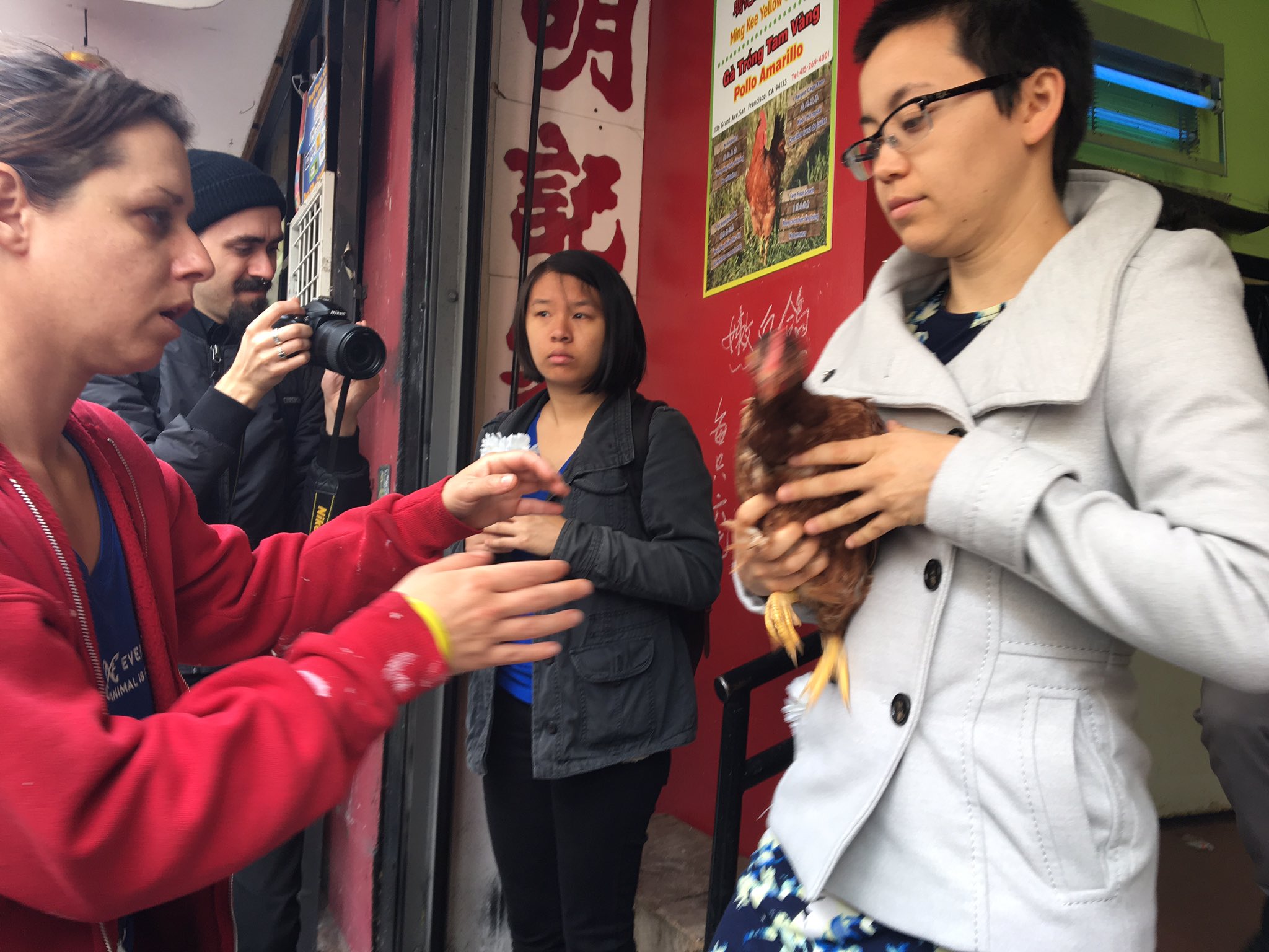 他们组织起约20名动保组织成员,到旧金山唐人街的“明记家禽”门口抗议,手持小白花为不幸惨死的鸡鸡们哀悼。期间,他们不顾店员阻止,冲进店铺,打开鸡笼,开始拯救鸡鸡,放生这些可爱的小生灵。