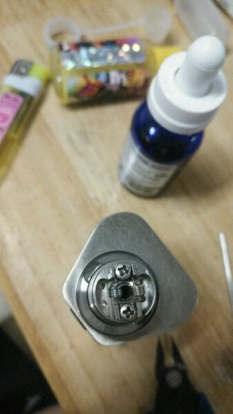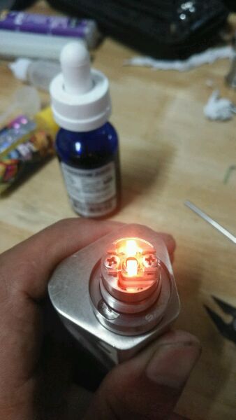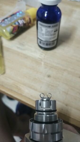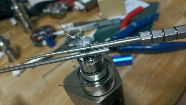 请大神指点,因为一直觉得kf5口感清淡,又看过论坛里说kf5可以做双发的帖子,但是只有直线双发,据说是供油不足,就是双发公用一条棉花那个。看到建议的有做并列双发的,但是一直没见到详细教程,所以就自己琢磨着做了一个,昨天做的双发是0.32a1丝,2.5圈径6圈,阻值在0.5左右,25w抽起来如同喝果汁一样浓郁顺滑。今天试了试五圈,0.48阻值,就稍微淡了点![[黑线]](/static/emoticons/u9ed1u7ebf.png)
