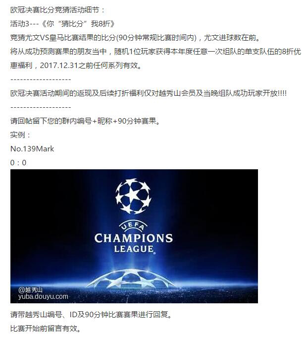 猜中比分,则将随机1位玩家获得本年度任意一次组队的单支队伍的8折优惠福利。