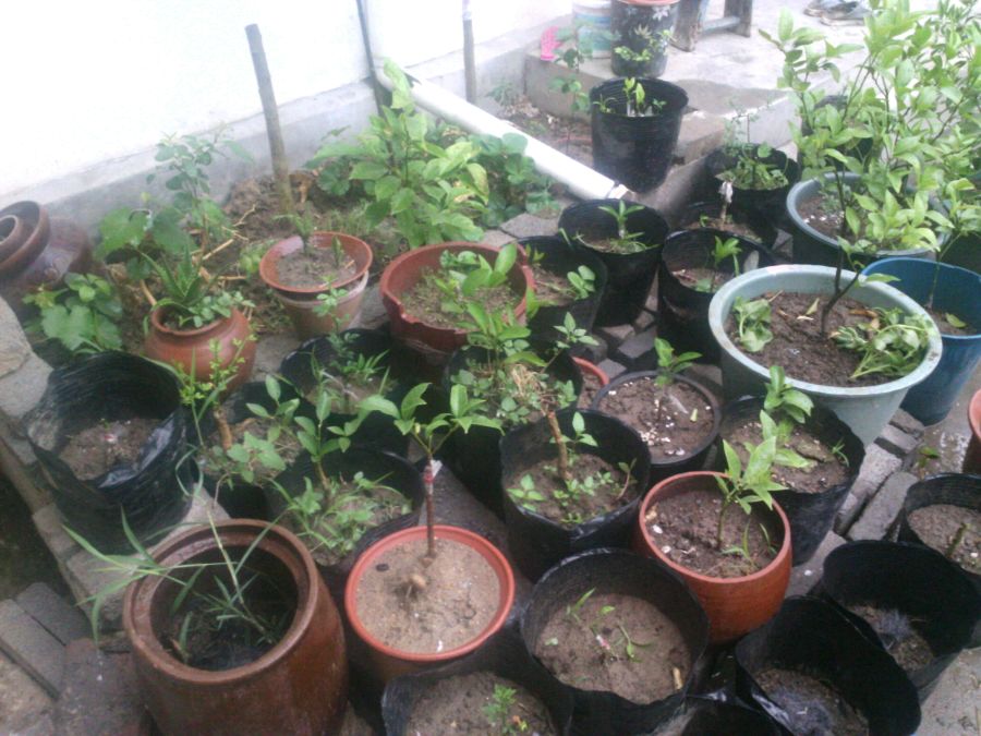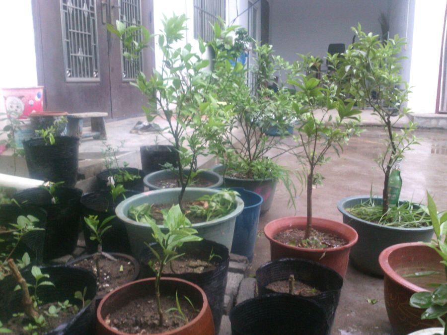 个分支,去年烂根了,赶紧拔出来种地下了,死的只剩一个分支右边那个大的是今年才弄来得,我同学他哥也爱养花,也一块玩,最近迷上了大橘子,嫌接的果小,不要了,就弄来了