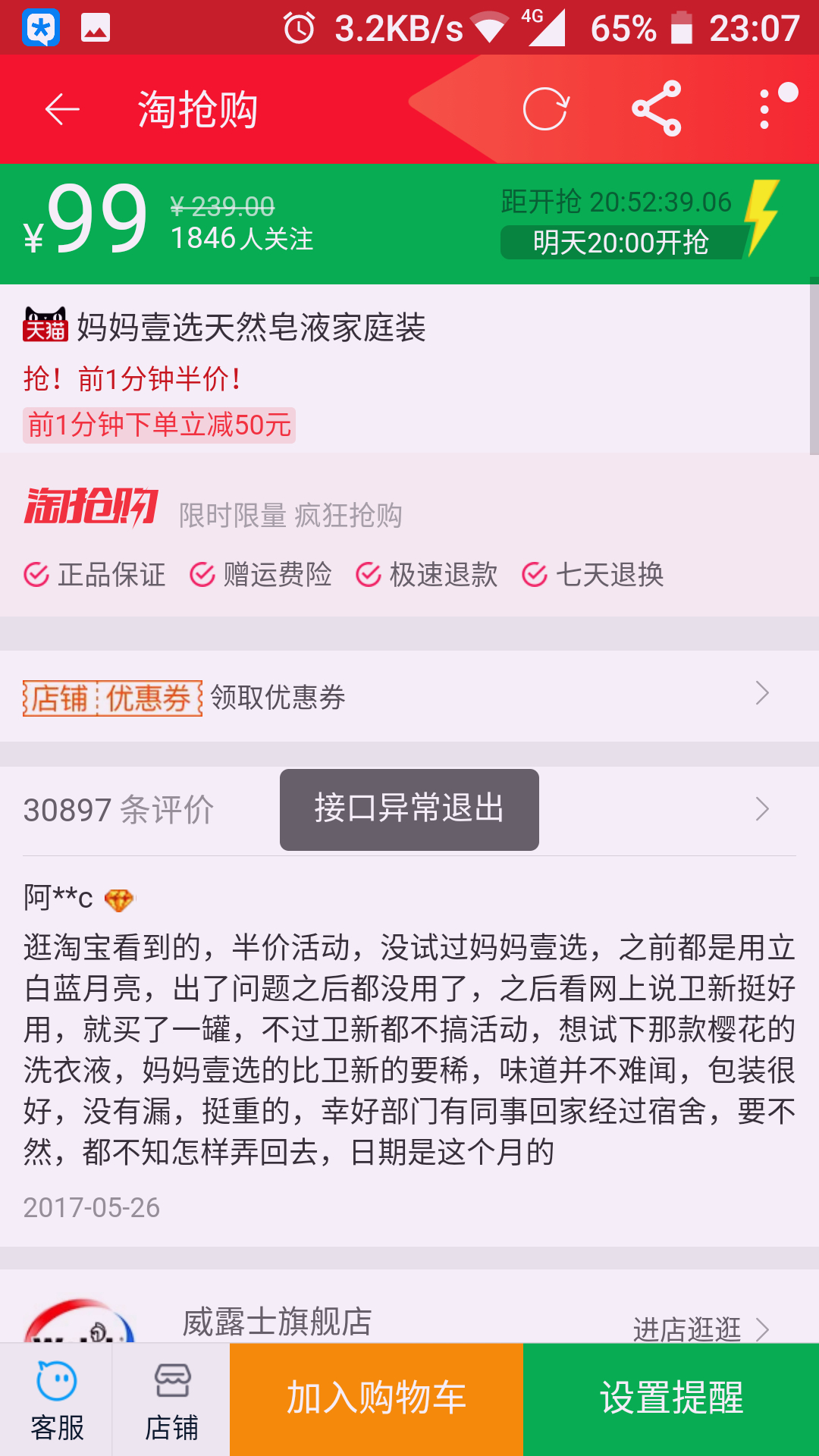 |170605|今晚用诺基亚6在淘抢购添加购物车失败,接口异常退出