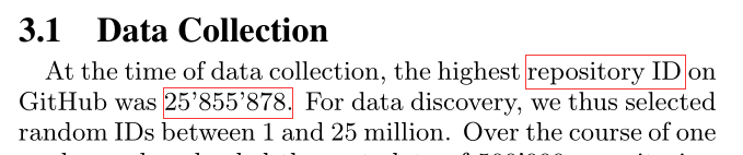 各位大佬!你们好!我有个问题想请教一下!github中的repository ID是什么?为啥在我的项目页面找不到呢?最近要做一个爬虫,爬取github上面的java项目,可是在搜索界面只能显示1000个,我还想爬取更多,看别人的论文,他们是通过repository ID来做的,这个repository ID到底是什么呢?多谢啦!