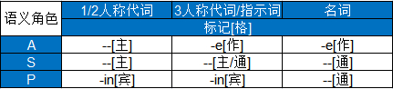继续之前,先说些评注。上面展示的样式衍生自这门语言固有的一个生命度等级。论元都分成三个基本类别:(1)第一和第二人称代词(2)第三人称代词和指示词(“这”“那”等) (3)名词,包括专名。这个等级系统自然语言里很常见,但David没有仅仅抄它,而是阐明了它背後的理论根据。他推理,标记是用来指示例外的——未预期的情况。这里,标记就是词尾,有两个。考虑到论元有三种类别,这些词尾就是用来界定那些未预期的角色。明白这点後,毫无意外,三类的S功能(主语;一价动词的唯一论元)果然都不带标记。毕竟如果一个动词只带一个论元,标记它做什么?这些格标记在二价句里才有用。