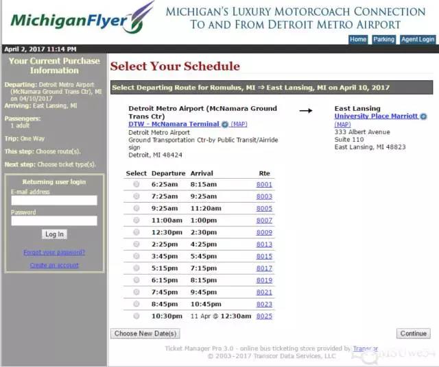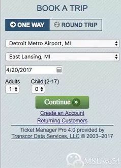 2. 选择自己的出发地点( Detroit Metro Airport ) 和到达地点(East Lansing ),日期以及人数。根据机票信息选择到达底特律的航空公司