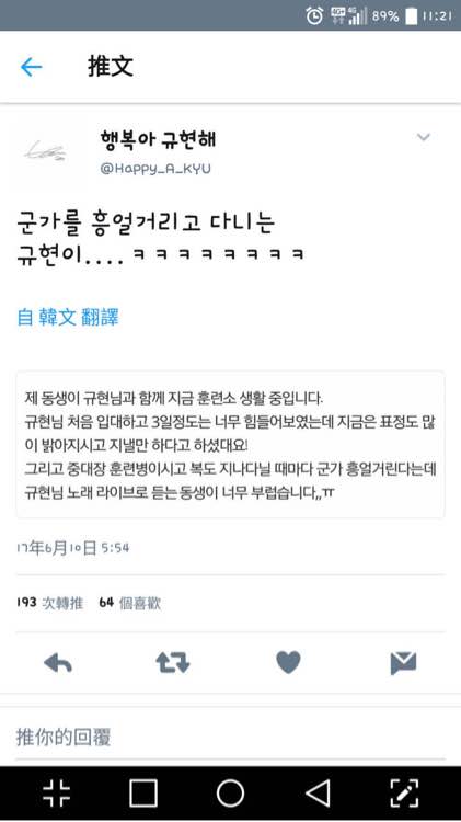推特上有人截圖關於圭在軍隊的狀況,原出處不明。