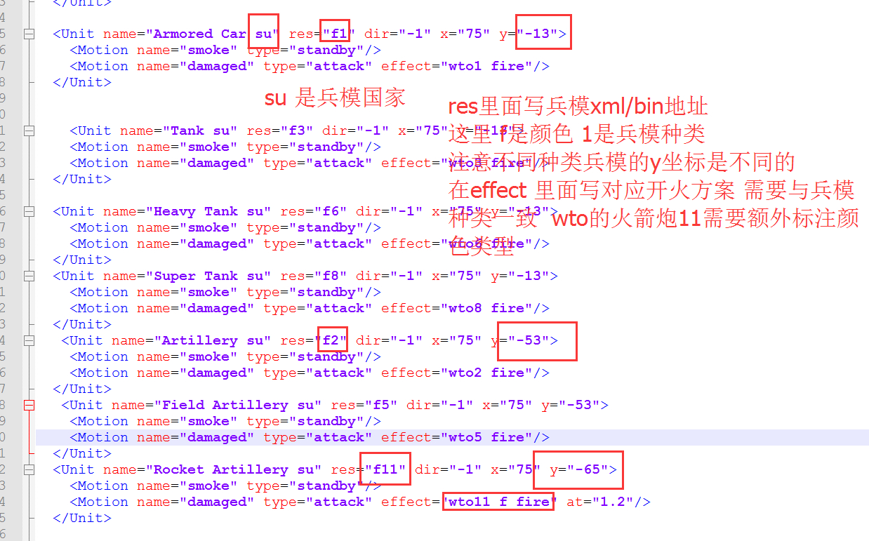 2 5 10 11 为火炮类兵模 modtion的位置为 y="-53"