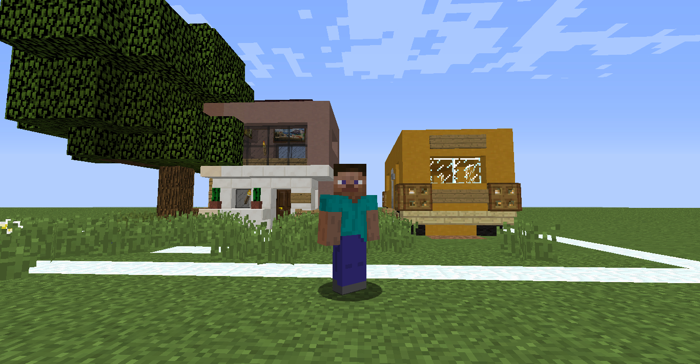 主人公steve是一个单身汉,是一位校车司机,旁边就是他的座驾,他的工资不高,只好自己盖了一栋5x5的小别墅 ,小别墅只有2层,没有厨房,吃饭只有外卖。