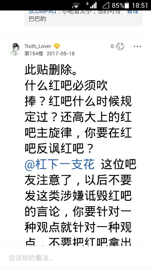 艾特你的又不看,你胡乱猜?你去后台找,看看杠花投诉的帖子的删帖日期,和我这个帖子的发帖日期,你比对一下!