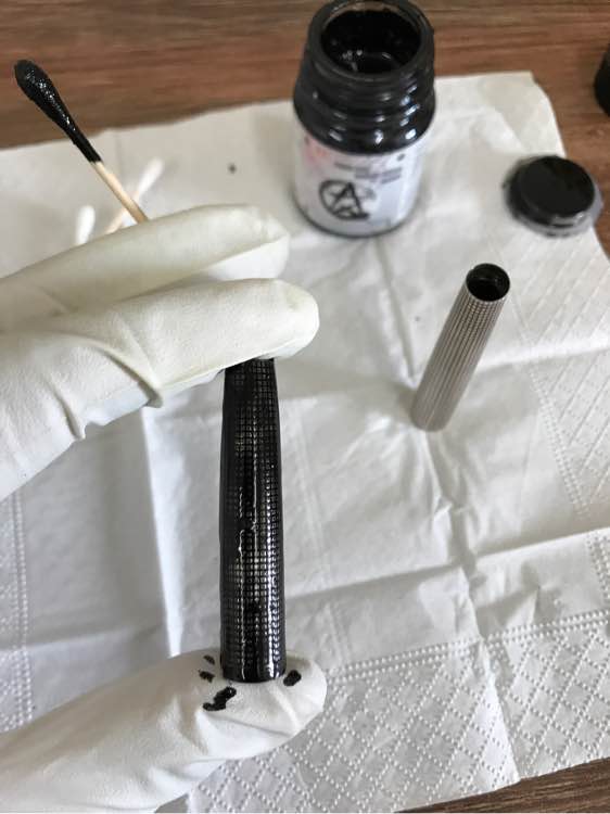 步骤二:用棉棒蘸漆均匀涂抹在笔杆笔帽上。涂完效果如图。然后静等30分钟。