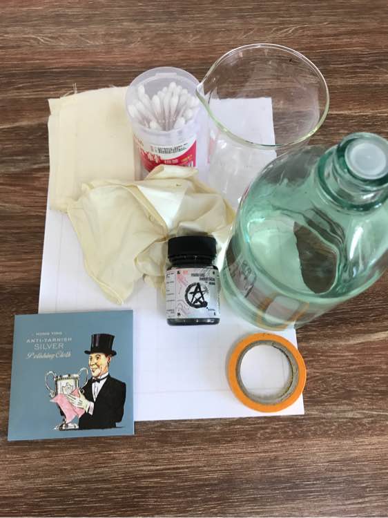 准备工作。需要准备黑色漆,稀料,一块不掉毛的棉布,玻璃器皿,棉棒,手套,擦银布。