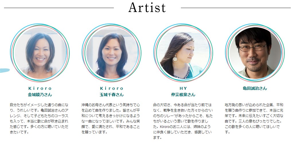 いのちのリレー 歌詞 歌:さんご 作詞:玉城千春 金城綾乃 仲宗根泉 作曲:玉城千春 金城綾乃 仲宗根泉 囁くような風が 月桃(げっとう)の葉をゆらす sa sa ya ku yo- na ka ze ga get to- no ha o yu la si 微风如细雨 轻摇月桃叶 あなたの笑顔に ありがとう a na da no e ga o ni a li ga do- 感谢有你的笑容 当たり前の日々に ありがとう a ta li ma no hi bi ni a li ga do- 感谢这平凡的时日 空には虹が輝いて so la ni wa ni ji ga ka ga ya i te 彩虹的光彩贯彻蓝天 でもそれだけじゃ ただ それだけじゃ de mo so le da ke jia ta da so le da ke jia 但不止这些 并不这些 その瞳は何を描いてゆくの? so no hi to mi wa nan wo e ka i te yu ku no? 那双眸中描绘出什么 ? 巡り巡って 出会った命よ あなたは私の全て me gu li met te te at ta i no qi yo a na da wa wa da xi no su be te 循环往复 生命相遇 你是我的全部 あなたの為に歌うよ あの日と今との いのちのリレー a na da no ta me ni u ta u yo a no he to yi ma to no i no qi no li le- 为你而唱 彼时今日 生命传承 色鮮やかにホラ 咲き誇れ i lo a za ya ka ni ho la sa ki ho ko le 艳丽色彩 灿烂盛开 モノクロの写真が私に問いかける「あなたは今幸せですか?」 mo no ku lo no xia xin ga wa da xi ni to i ka ke lu "a na da wa i ma xi a wa se de si ga?" 黑白照片询问我 : “ 你如今幸福吗?” 赤い海、黒い空の色をどれだけの人が知っていますか…? a ka i u mi、ku ro i so la no i lo wo do le da ke no hi to ga xit te i ma si ga...? 血染红海 黑暗天际 何人曾记? でも 生きている そう ここにいる de mo i ki te i lu so- ko ko ni i lu 但是 我还活着 是的 在这里活着 大切な命を繋いでいくよ da i se ci na i no qi wo ci na i de i ku yo 珍贵生命 终将维系 巡り巡って 生まれた命よ あなたは私の全て me gu li met te u ma li ta i no qi yo a na da wa wa da xi no su be te 循环往复 生命诞生 你是我的全部 あなたの為に歌うよ わたしが語り継ぐ いのちのリレー a na da no ta me ni u ta u yo wa da xi ga ka ta li ci gu i no qi no li le - 为你而唱 由我传颂 生命的传承 あの日をもう二度と 繰り返さないように a no hi wo mo- ni do to ku li ka e sa na i yo- ni 愿那时那日 永不重现 繋がる涙 繋がる笑顔 未来に羽ばたく架け橋になれ ci na ga lu na mi da ci na ga lu e ga o mi la i ni ha ba ta ku ka ke ha xi ni na le 泪花与笑声相连 化作飞往未来的桥梁 見上げた夜空の星達が 道しるべとなって照らしてるよ mi a ge ta yo zo la no ho xi da qi ga mi qi xi lu be to nat te te la xi te lu yo 遥望夜空 星星照耀如路标 あの日をもう二度と 繰り返さないように a no hi wo mo- ni do to ku li ka e sa na i yo- ni 愿那时那日 永不重现