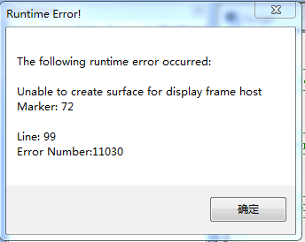 在用MovieDisplay调用视频文件是出现的错误提示如下,视频文件后缀是符合要求的.mpg,视频文件放在程序同一个文件夹下,调用过程应该也没有问题,视频文件的大小是17M,Generate是成功的,但正式run的时候报错,出错原因可能是什么呢?和分辨率设置有关吗?求助大神~谢谢!