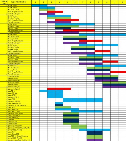 现实中的坦克之间是没有等级概念的,只有强弱的区分。但WOT是一款游戏,这就意味着必须人为的用等级将坦克的强弱区分开来,通过一条条完整的坦克研发线路图划分坦克的实力。一辆同类型高级别坦克必然能够压制低等级坦克,这是理所当然的事情。就好像虎式坦克,给你一万个理由都不可能干掉虎王。在游戏中,坦克一共划分为10级。从1级升级到10级是一个漫长的过程,按照官方的推测,大概需要耗费一个玩家三个月左右的时间。