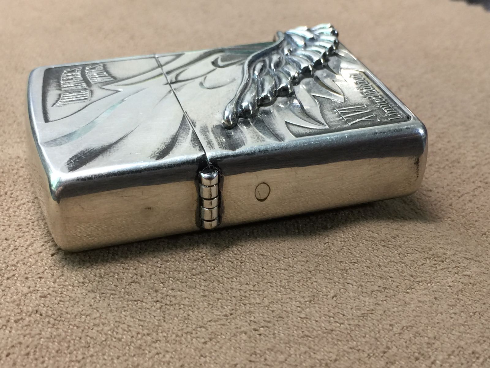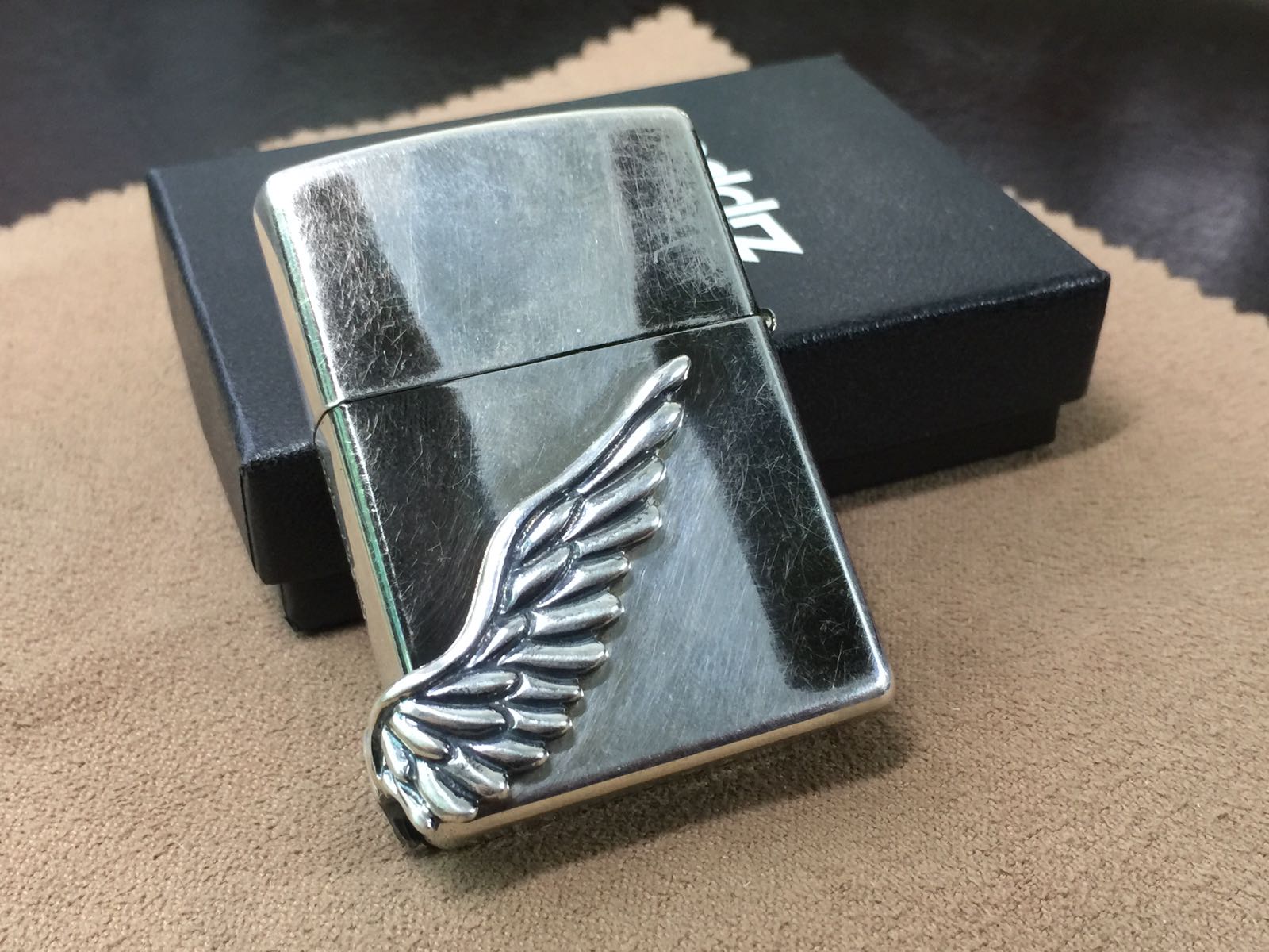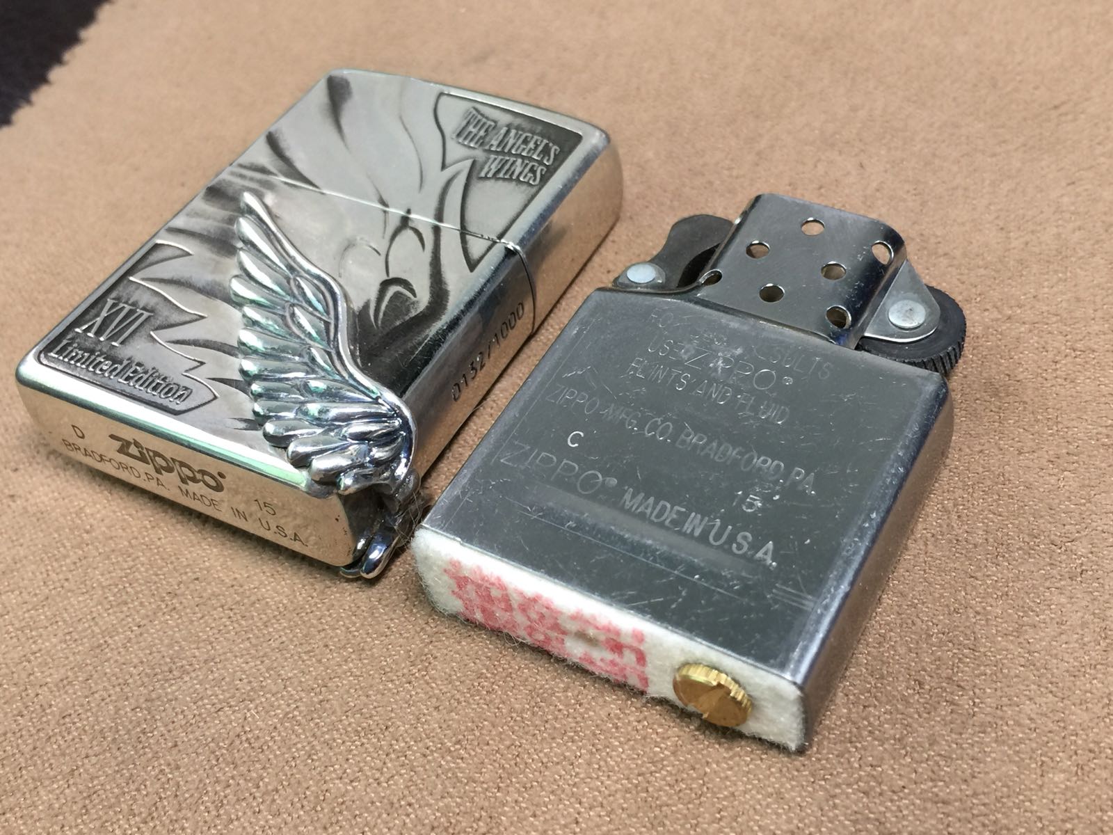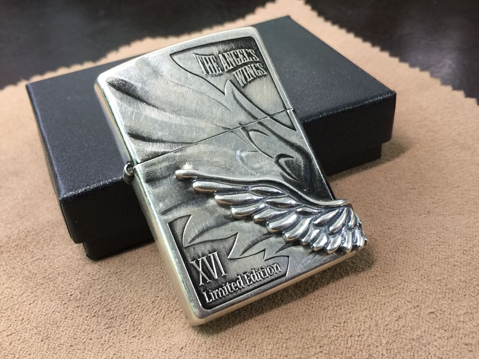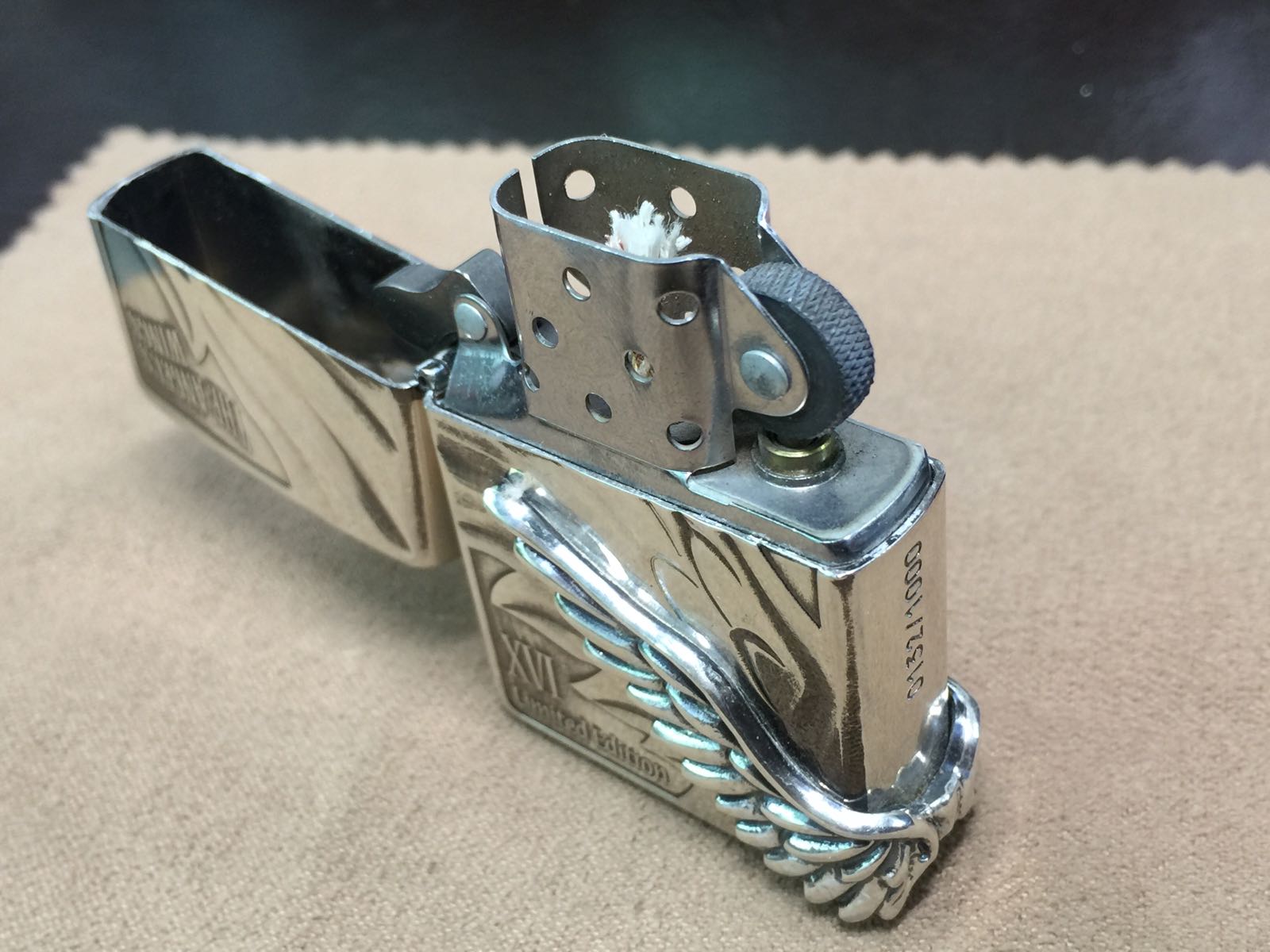【具体描述】二手2015年4月 幻影天使之翼 限量1000,本机编号0132。机身镀银底板,大面积蚀刻+精美天使之翼侧包贴章工艺,机身背面和周身局部黑色为原厂做旧效果 非污渍。整机正常使用擦丝局部擦痕,无磕碰,铰链正常,原配15C内胆打火强劲,黑纸盒包装。