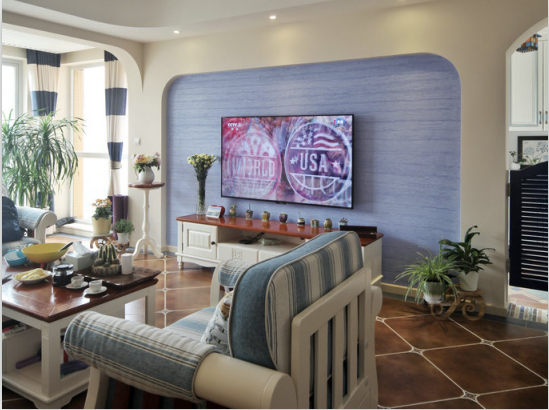 在客厅里,最主要的是电视墙的美化,地中海简约的造型方式得到了启用,弧形的轮廓内刷上目前最流行的蓝色硅藻泥。