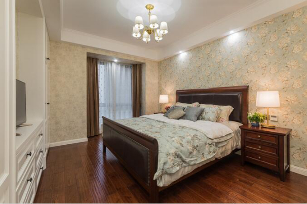 卧室的处理也是很简约,顶面用简单的吊顶再安上几枚筒灯,墙纸碎花的选择也很棒,因为客户的卧室整个空间较长,所以设计师选择了做衣柜+电视柜的设计,让整个空间的大小不得到任何损失,而又增加了储物性。