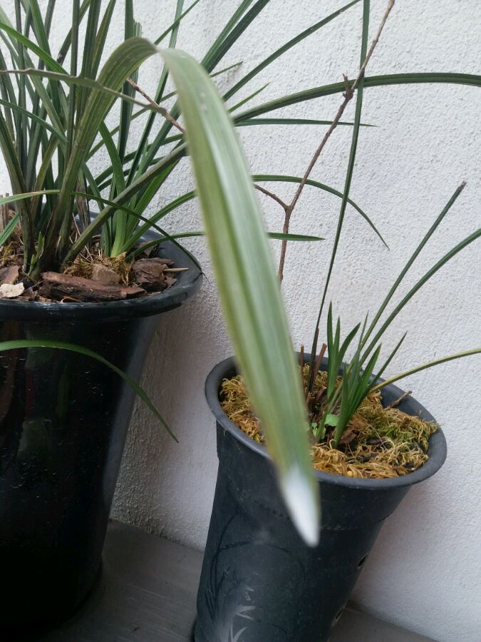 长在叶脚壳中,叶钝尖。右边-小盆是春兰奇花