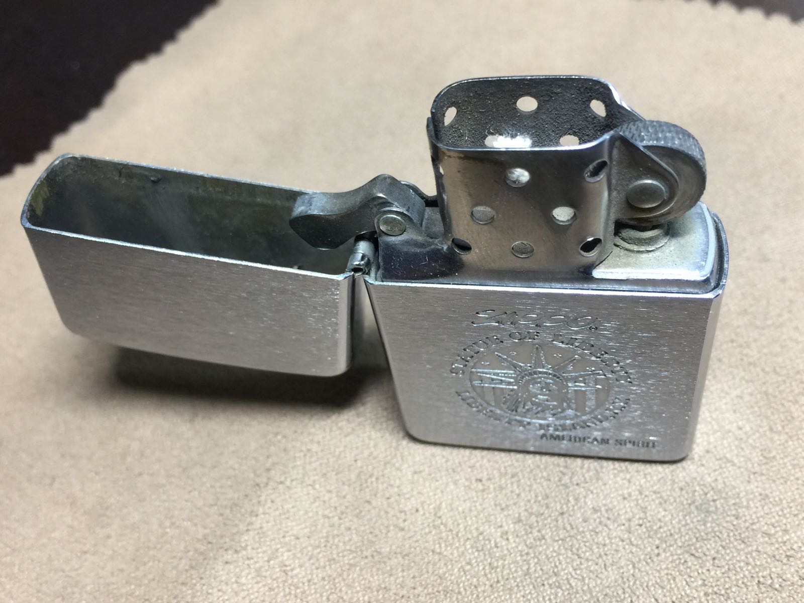 【具体描述】二手1994年4月 拉丝蚀刻工艺 自由女神。机身正常使用擦丝划痕,边角针眼和小磕略多,定义差品。铰链正常,后配99D内胆打火中等,摆锤少许磨损,无包装。