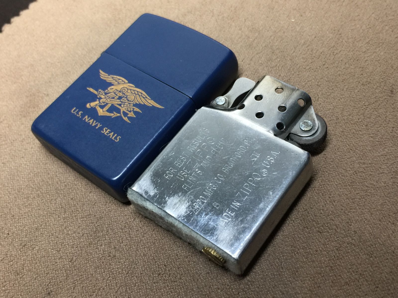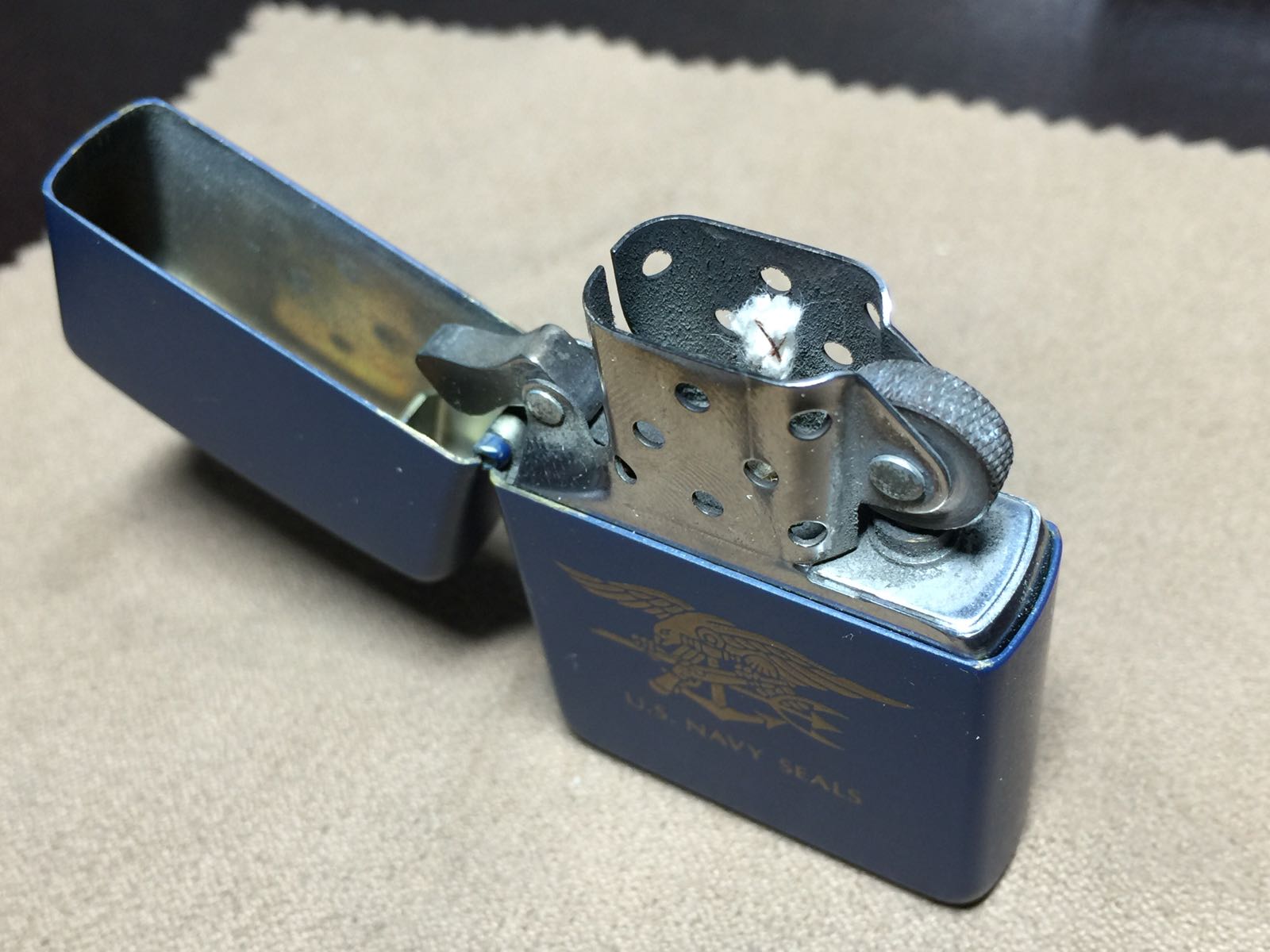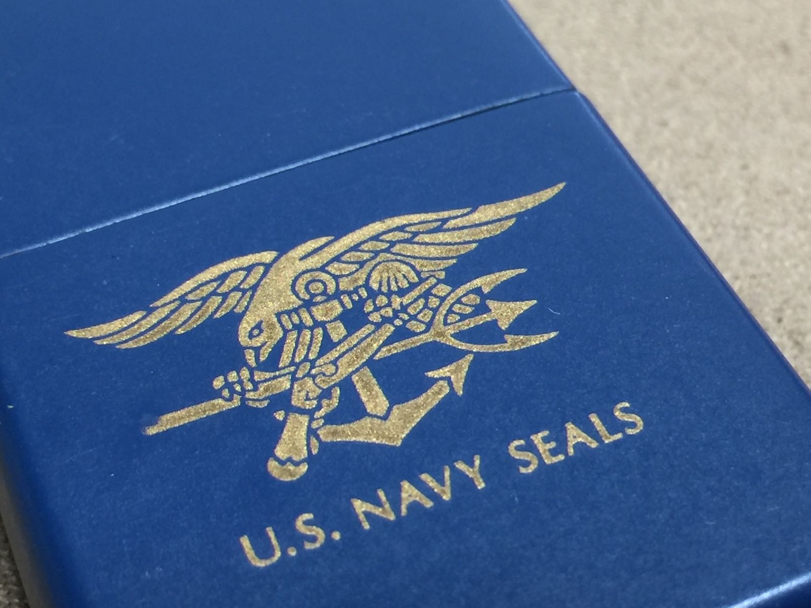 【具体描述】二手1996年 雅漆烫金工艺 U.S. NAVY SEALS 美国海军海豹突击队,反底刻。机身正常使用痕迹,八角无磕碰,局部极轻微擦痕,铰链少许掉漆,底部一角轻微擦伤露铜(微距拍出)总体品相不错。铰链正常,原配96B内胆打火不错,黑纸盒包装。