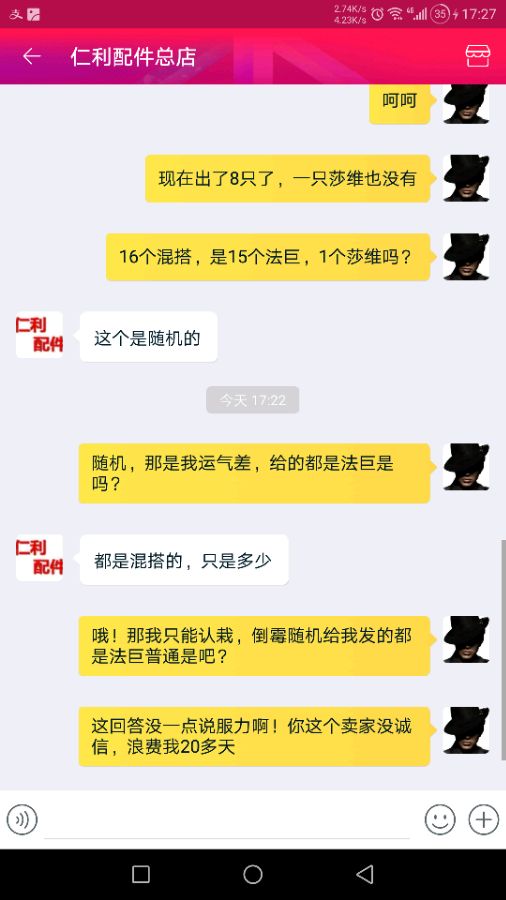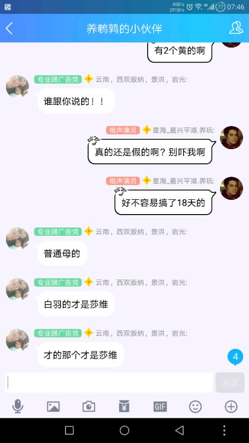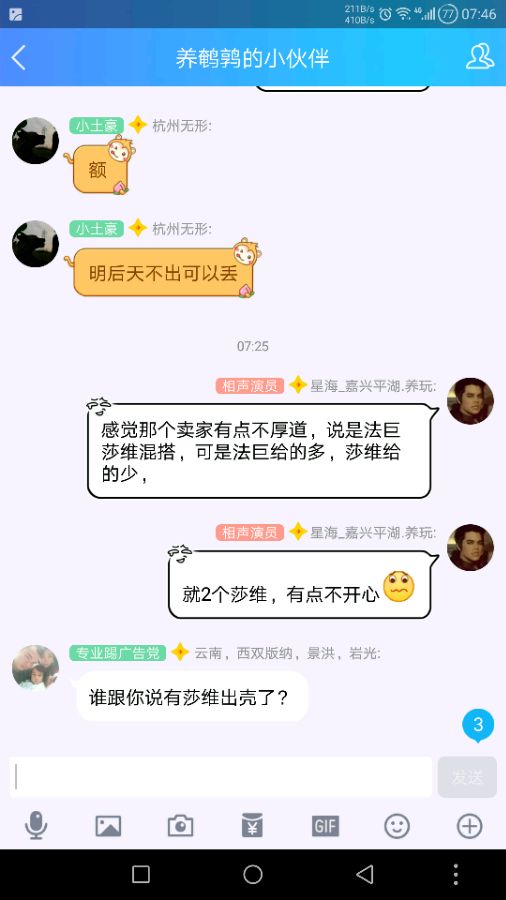 还要说一件事,就是某宝卖种蛋的那个骗子,买了法巨加莎维混搭的16个蛋,然后一只莎维都没有,那卖家就说让我认倒霉,说什么随机的,给了15个法巨1个莎维就是我运气差,这解释也太没说服力了吧!还拖了5天才发货,说蛋少让我排队,。排队就排队了,可拿假货骗人就是一个没诚信的人。后面我也看了别人评论,出11个,莎维却一个也没有。楼下看图