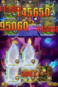 上前两图是第一回合炮姐携带的宠物跟炮姐对关卡五个目标的攻击输出,后两图是惩戒大大姐携带的宠物跟惩戒大大姐对关卡五个目标的全体攻击.其中暴力炮姐攻击后被其中一个小怪冰封。其中最后一图可以看到,惩戒大大姐对恶魔攻击145650,被反伤50977.反伤比例在30%左右。