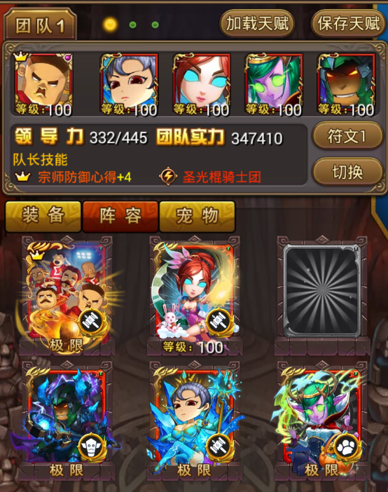 如图,符文偏向法系输出是因为惩戒大大姐跟暴力炮姐都是法系输出卡牌,宠物携带两只奶复(永恒守护者+灵魂治愈)跟三只狂暴系库肯(熔岩吐息+雷霆/闪电),上三只奶复肯定比较稳但是输出不够,当两只奶复可以站稳的时候基本也能通关了!最后给大家分享一下通关阵容