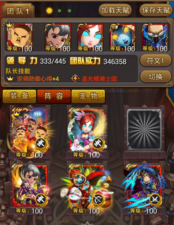 如图,符文偏向物理系输出是因为黑暗游侠跟暗袭落雁都是物理系输出卡牌,宠物携带三只奶复(永恒守护者+灵魂治愈)跟两只狂暴系库肯(爪击+撞击)!最后给大家分享一下通关阵容