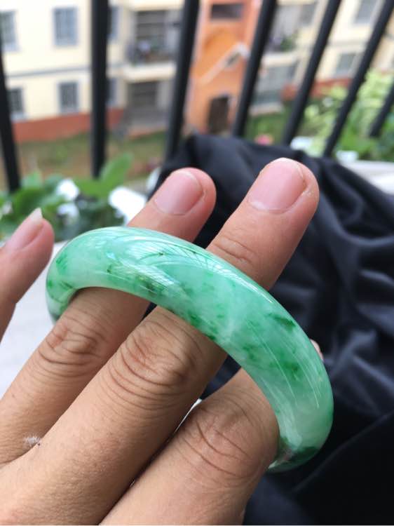 糯种飘翠绿手镯,局部深绿花,质地细腻,绿色很多,颜色很正,有条棉线并混合着极其细小的纹,三围:56/14.1/8.4,价格:12000