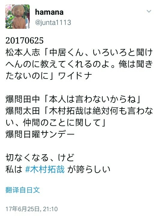 https://www.bilibili.com/video/av2201168/上面的视频里,木村谈到偶像, 也谈到对自己的定位是什么 (非常厉害,对自己的认知非常清楚,20多年来,这个定位认知一直没有改变), 在13分钟左右。