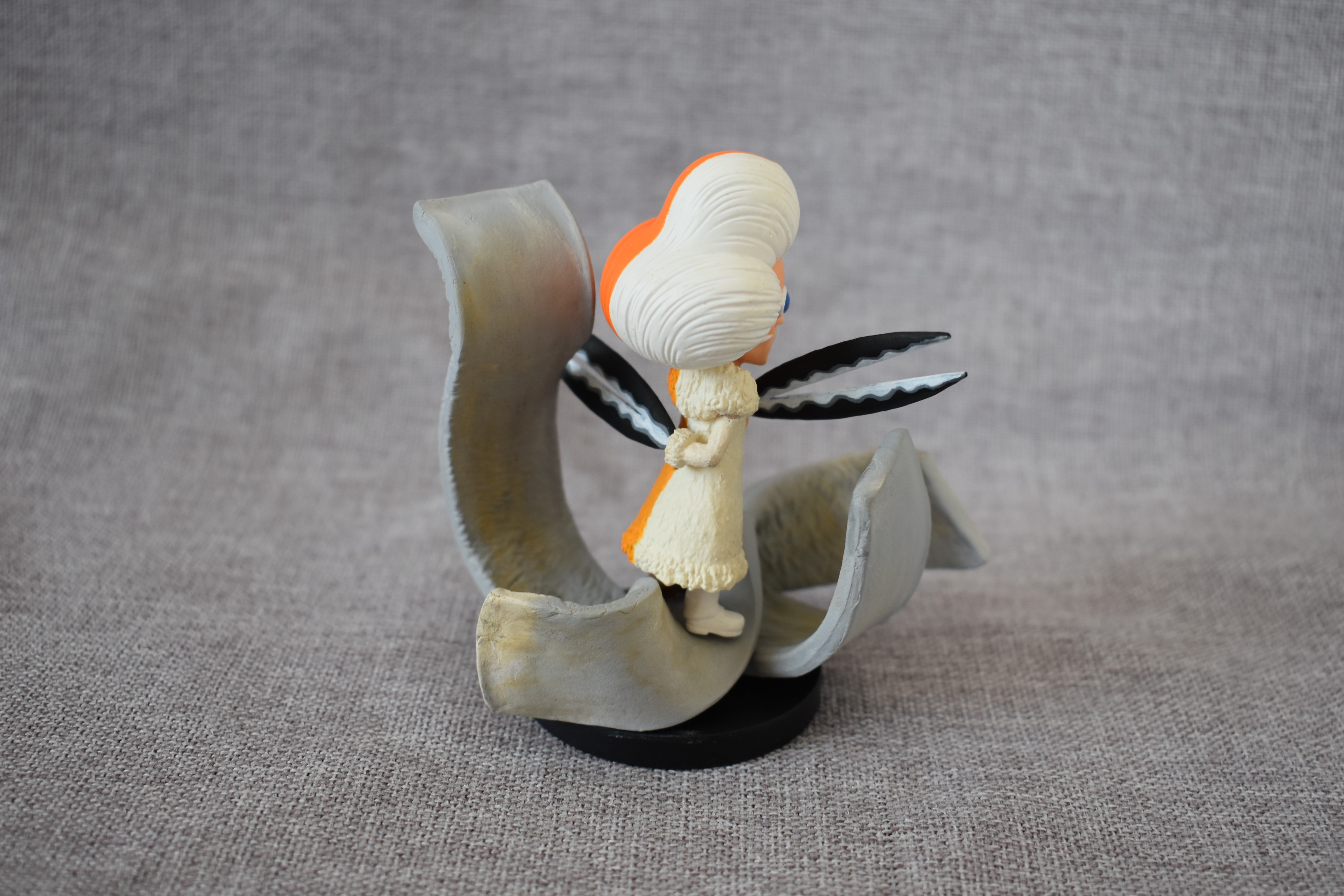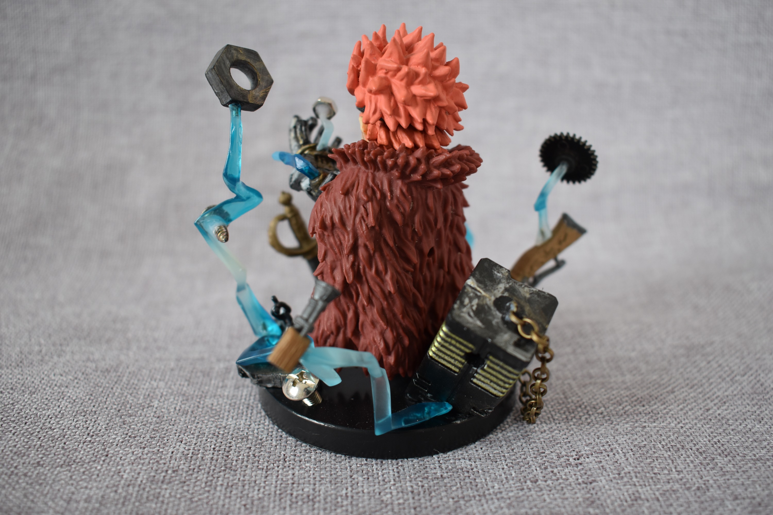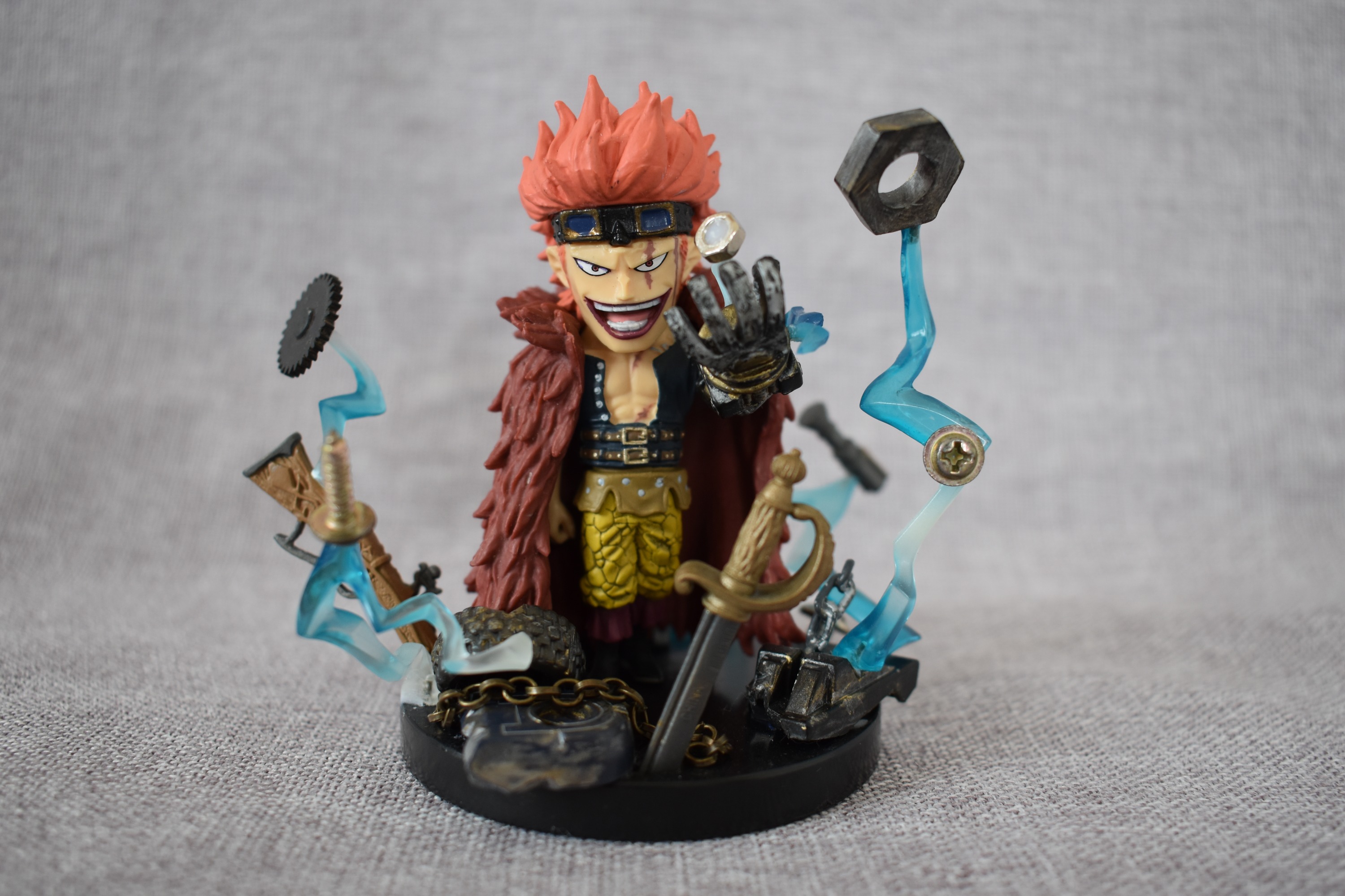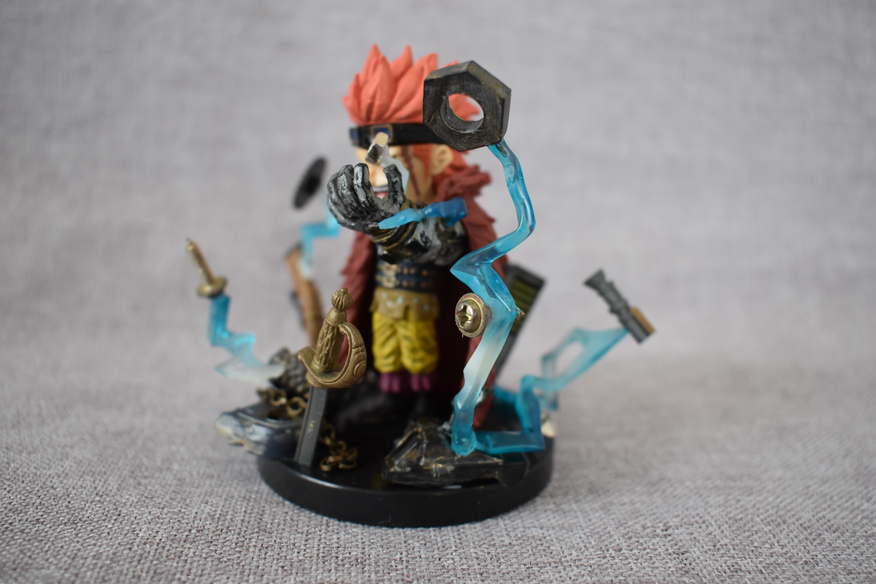 闪电的出场感觉很绅士,左右不同配色也很有特点,刚做剪刀手时是两手交叉放在胸前,做完整个重心都在前面一直前倾,也挡住了大部分身体,便改成了一只手放在腰后感觉绅士一点,地台则是被剪开的扭曲地面,很多人摆顶上场景时大多是白胡子团、海军、七武海这几个,闪电也是顶上少不了的一员阿~~~