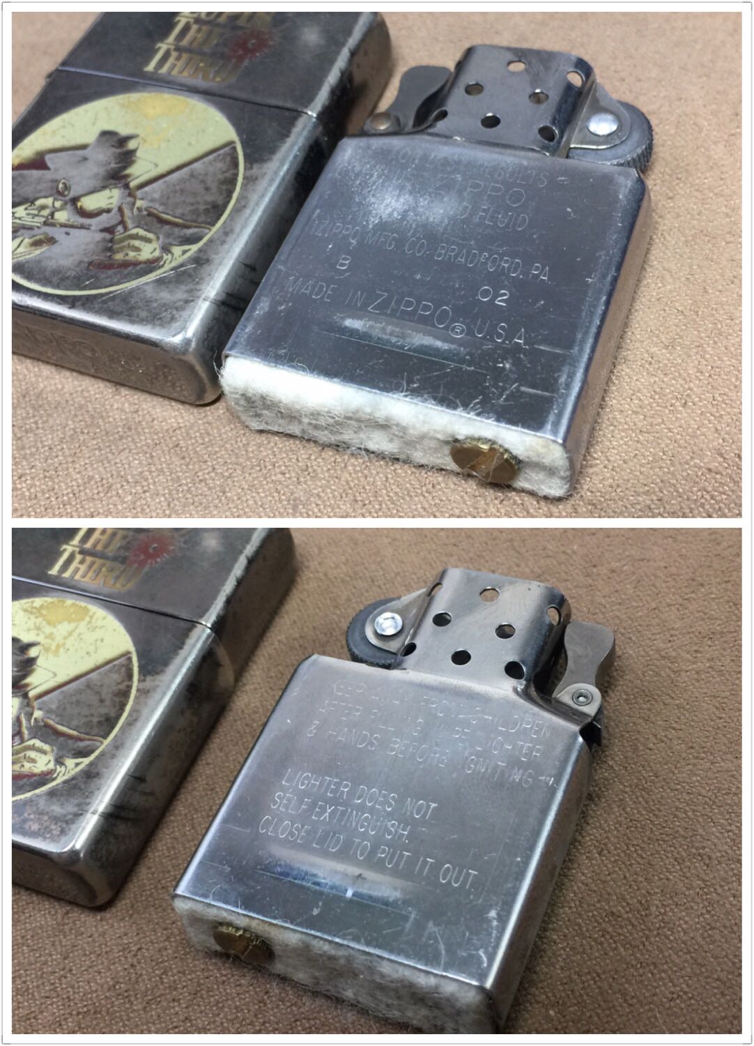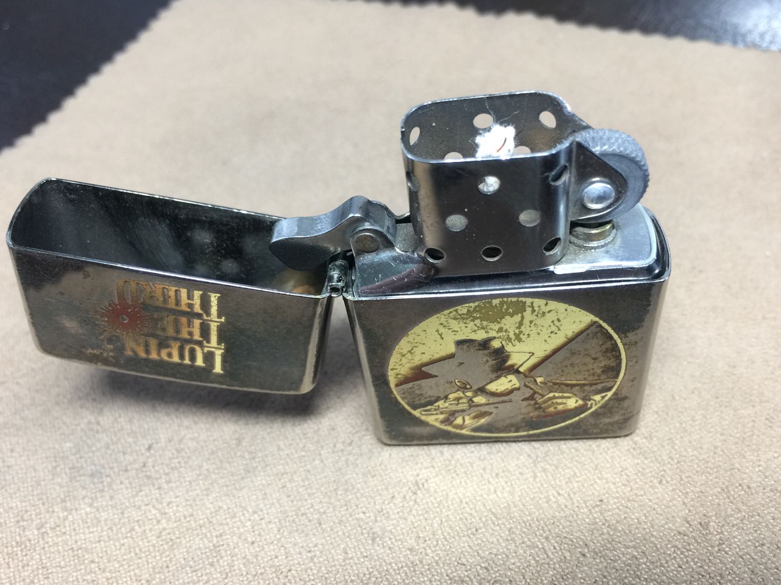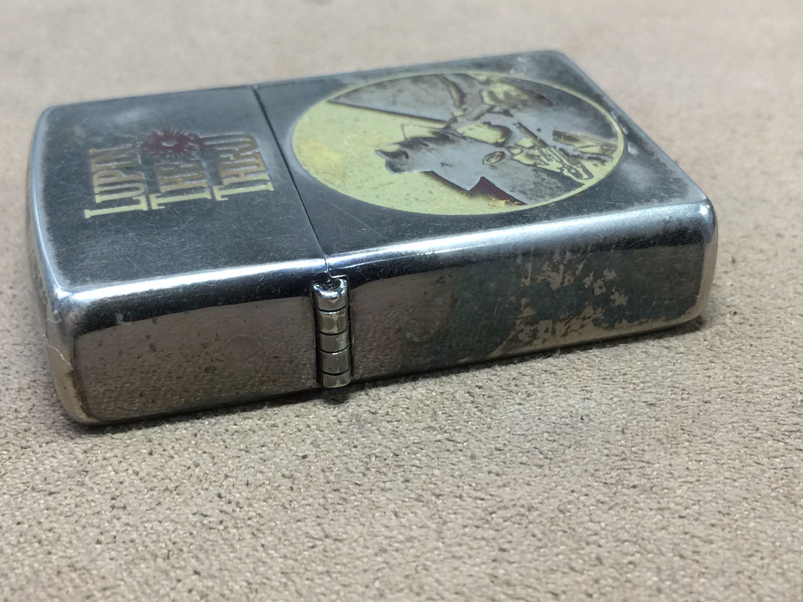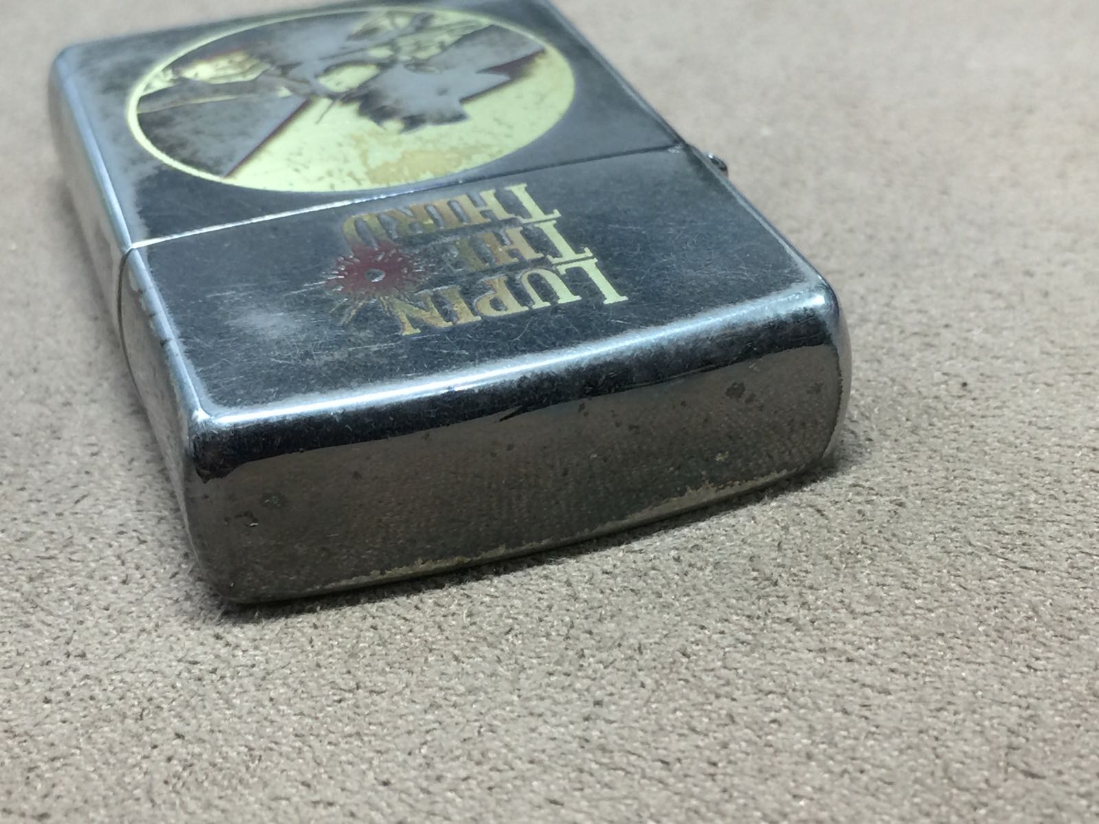 【具体描述】二手2002年鲁邦三世,黑冰底板双面蚀刻填漆工艺。机身镀层较多磨损,顶部一处小凹,底部小磕均微距拍出,定义差品。铰链正常,原配同年同月内胆已更换全新进口火轮,打火强,无包装。