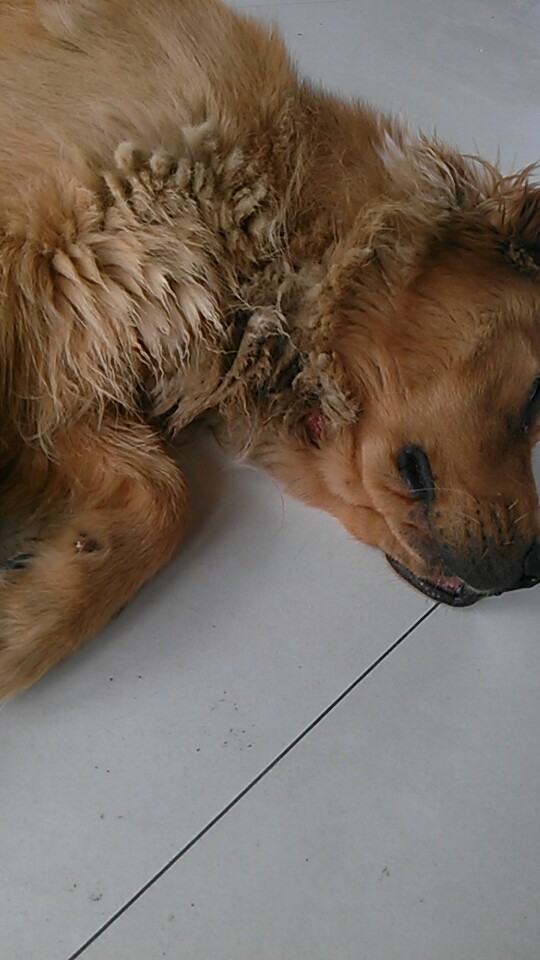 金毛不知道怎么了 脖子的位置破了 ,还有臭味,不吃东西,还往外反水 ,前天是白色 昨天返了一口绿色的 今天一直没吃饭 还返了一口黑色的。带到防疫站打了几天真 也一点没好转,强大的吧友们,帮看下 我家提莫这是怎么了