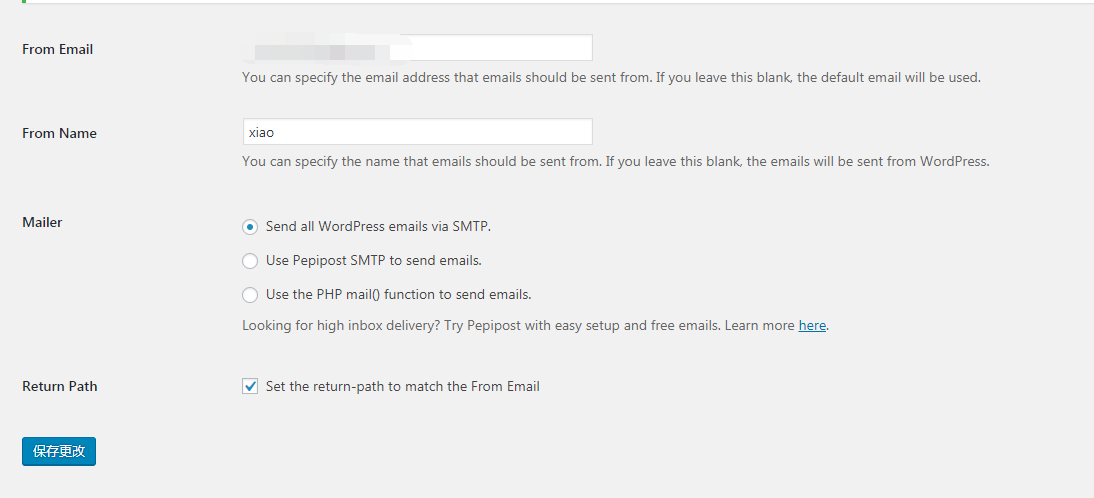 配置时,如果是 QQ 邮箱,插件前两项填写你 QQ 邮箱地址和想使用的昵称,下面项填写 QQ SMTP 服务器地址和你 QQ 邮箱的账号密码。