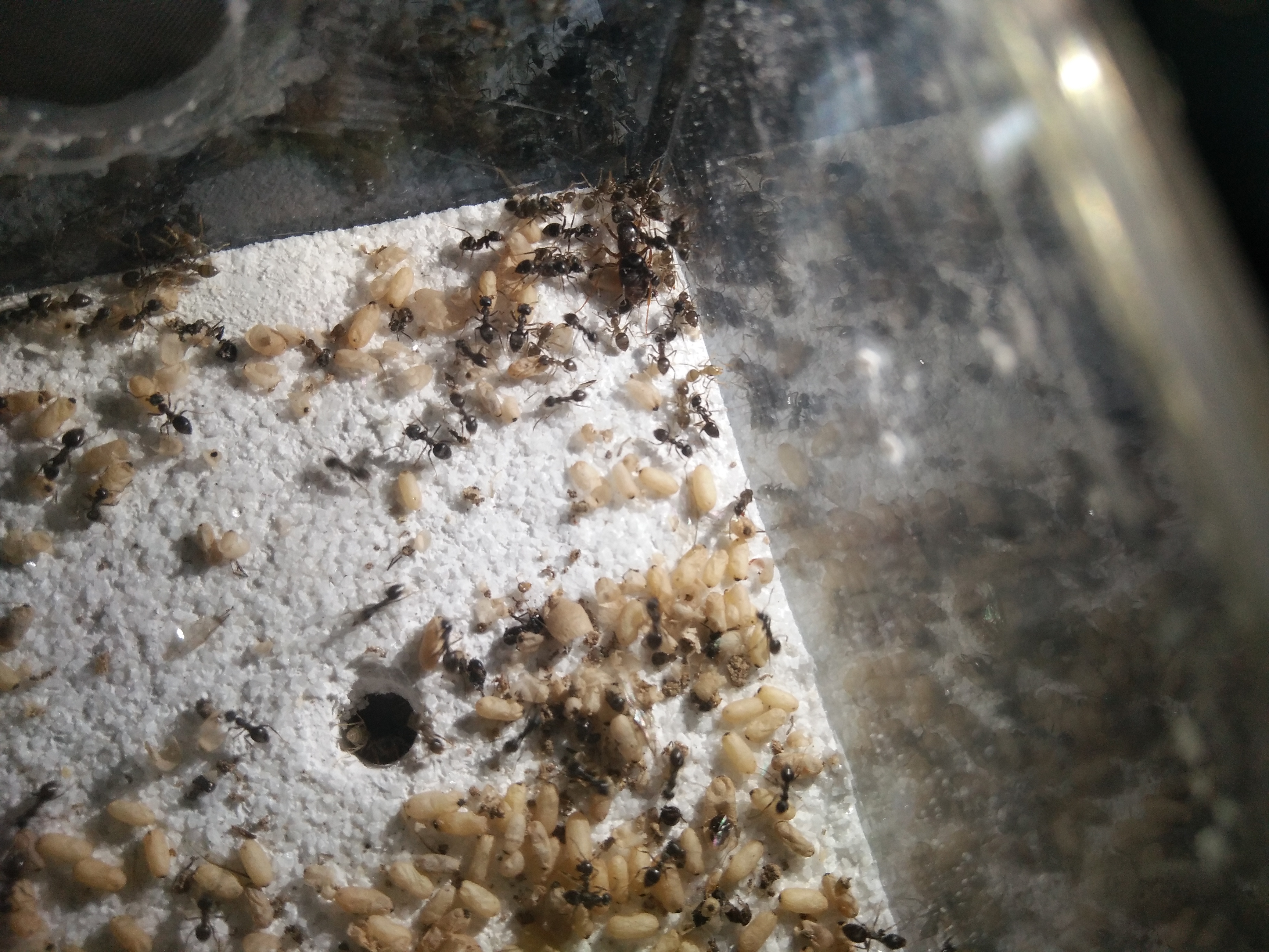 这只后是6月12号抓得,经过两次合茧(100个左右)。捉到之后一直没有决定到底养不养,就在竹节巢里闷了20天。昨天看的时候发现产卵了,而且破茧的工蚁也有几十个,这才决定养下去并开个记录贴。……现在1后70+工,茧50左右,卵10+