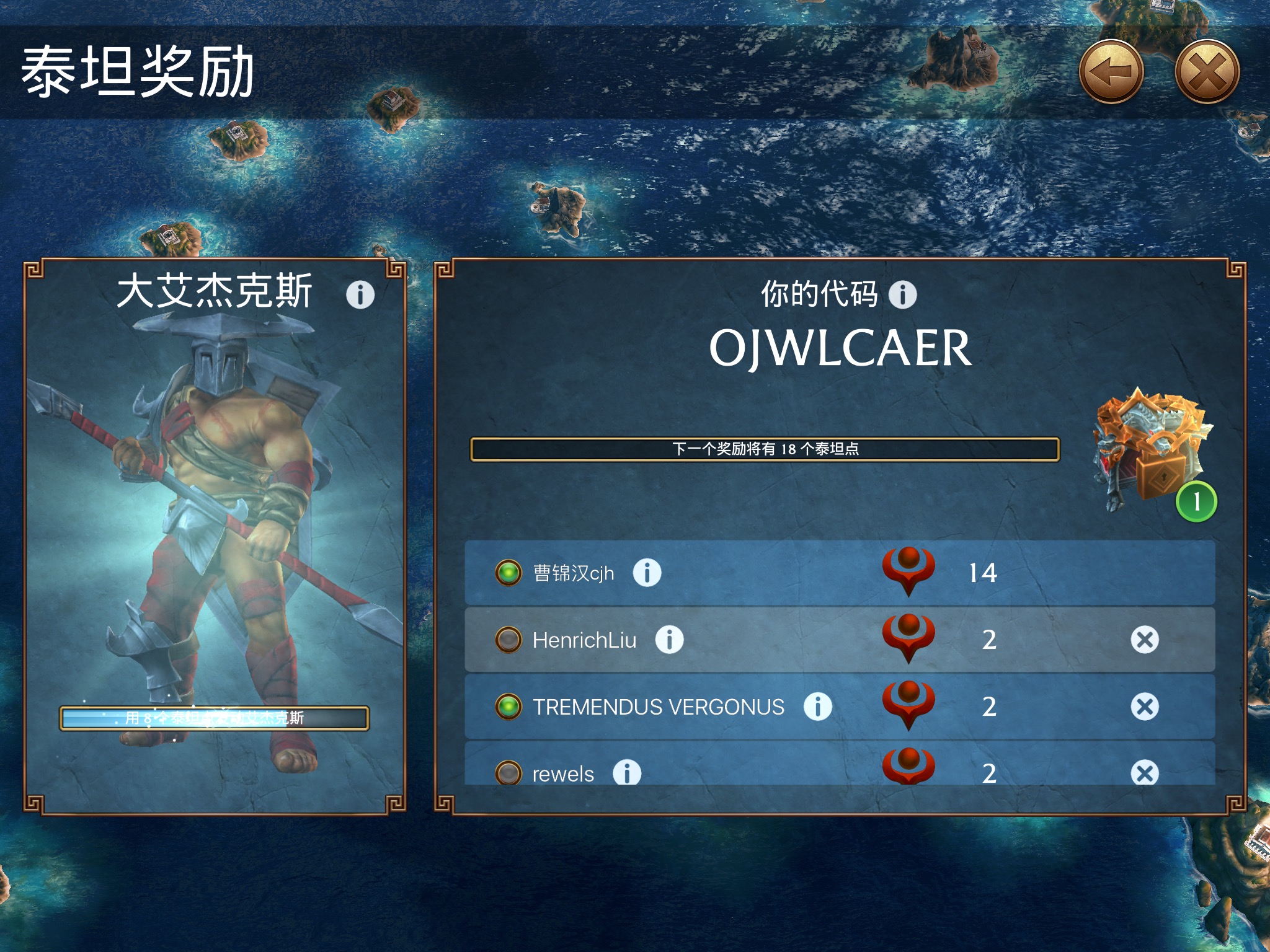 每天在线哟 输入这个代码OJWLCAER 每天帮你加泰坦点 想要早点获得英雄的请输入我的代码OJWLCAER 新手的朋友们好像还可以开宝箱哟