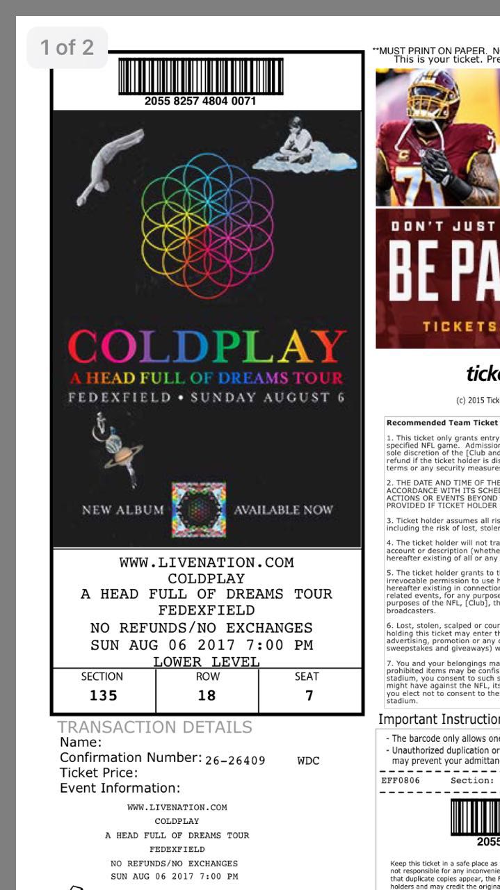 转卖酷玩8.6美国Fedex Field演唱会门票