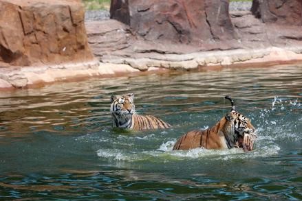 7月4日,世界最大东北虎人工饲养繁育基地——黑龙江东北虎林园内,东北虎因持续高温天气纷纷跳入人工池塘内避暑乘凉,在水中嬉闹、争抢活食。