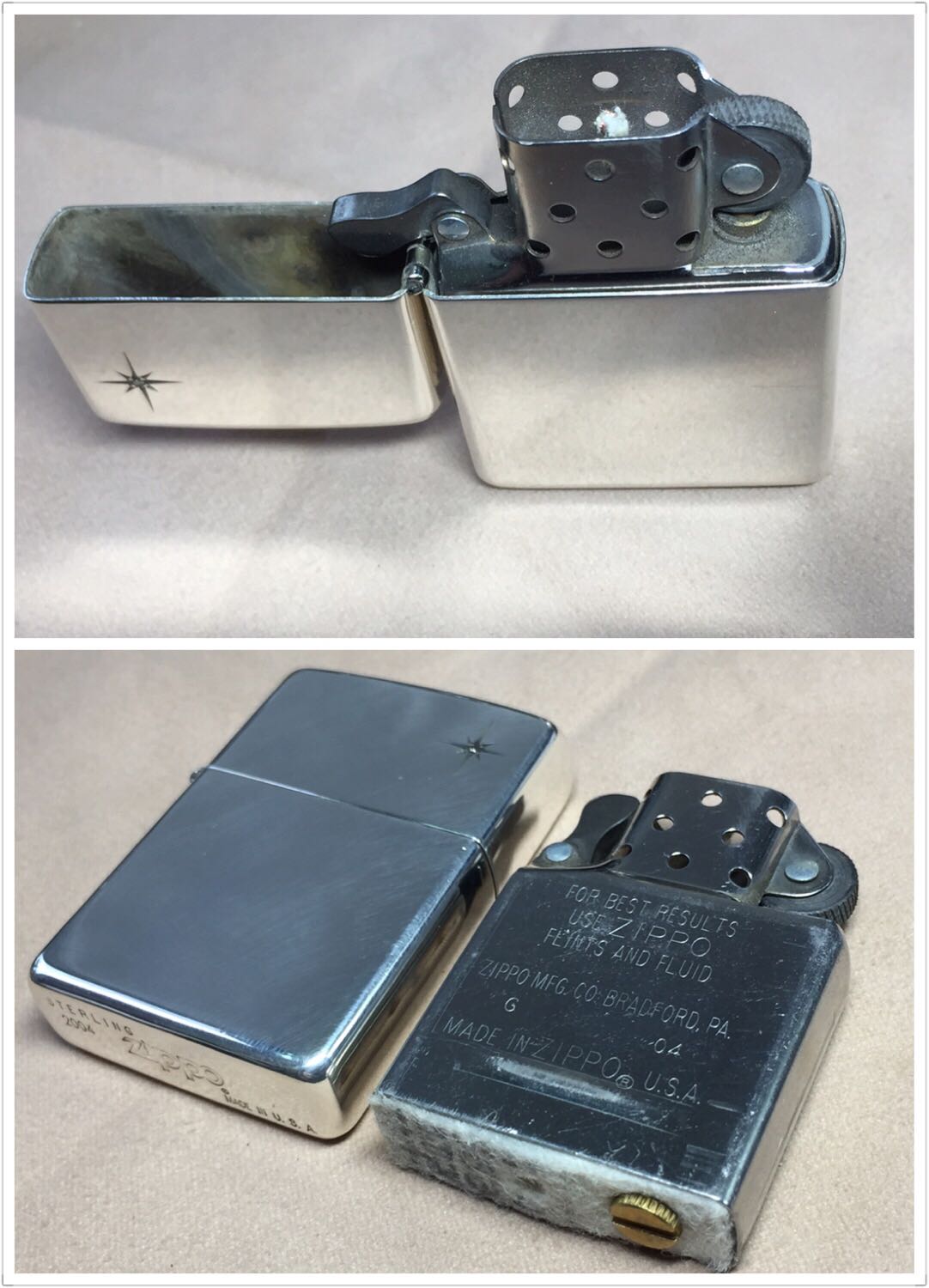 【具体描述】二手2004年纯银机,镜面深雕 爪镶天然钻石工艺。机身正常使用擦丝擦痕浅划痕强光拍出,无明显磕碰(修复过边角小磕)铰链正常,原配04G内胆打火强劲,后配黑绒盒。