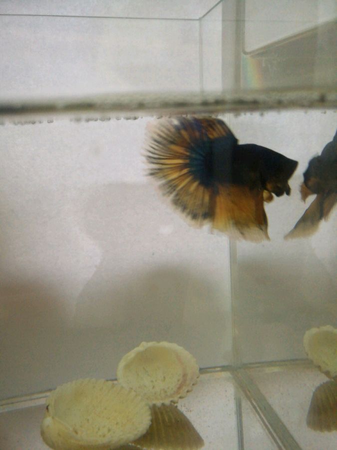 顺便补充一下,平时经常这样一个不动的状态,但是敲打一下鱼缸,也能很快的游动两下。但是明显没有以前那样拿掉隔板爱斗的激情了。鱼缸里我也放一株蜈蚣草,今天拿出去晒了。