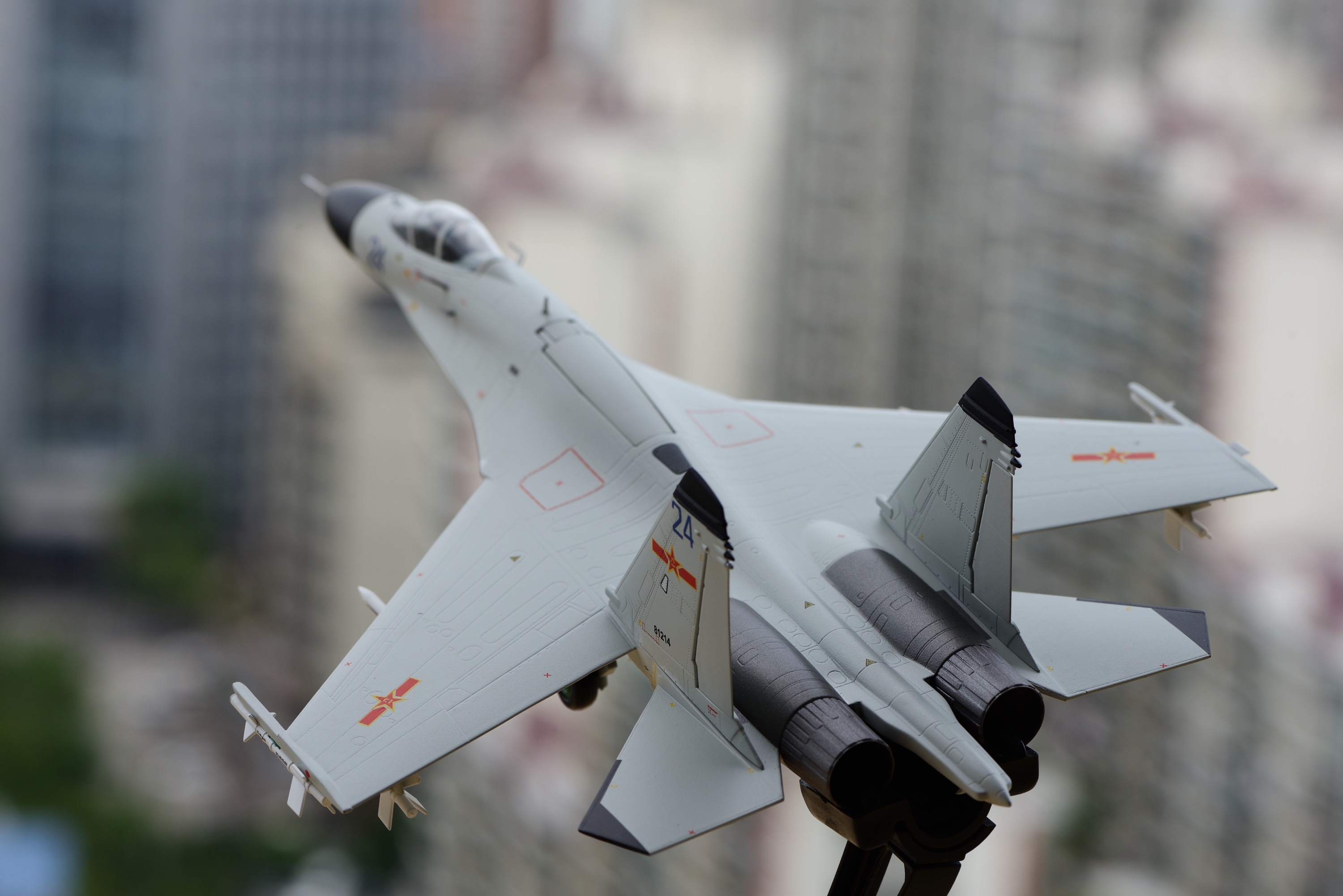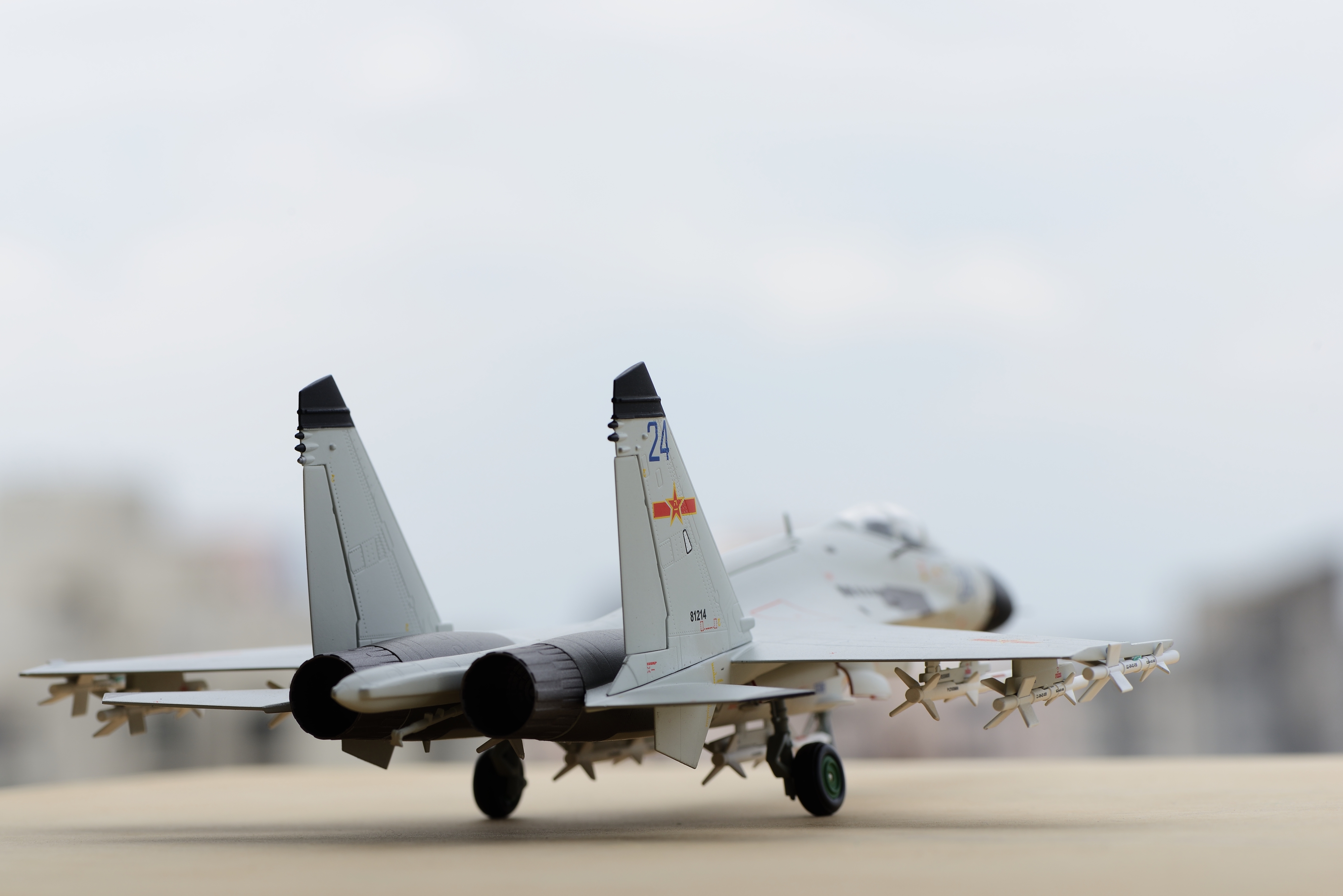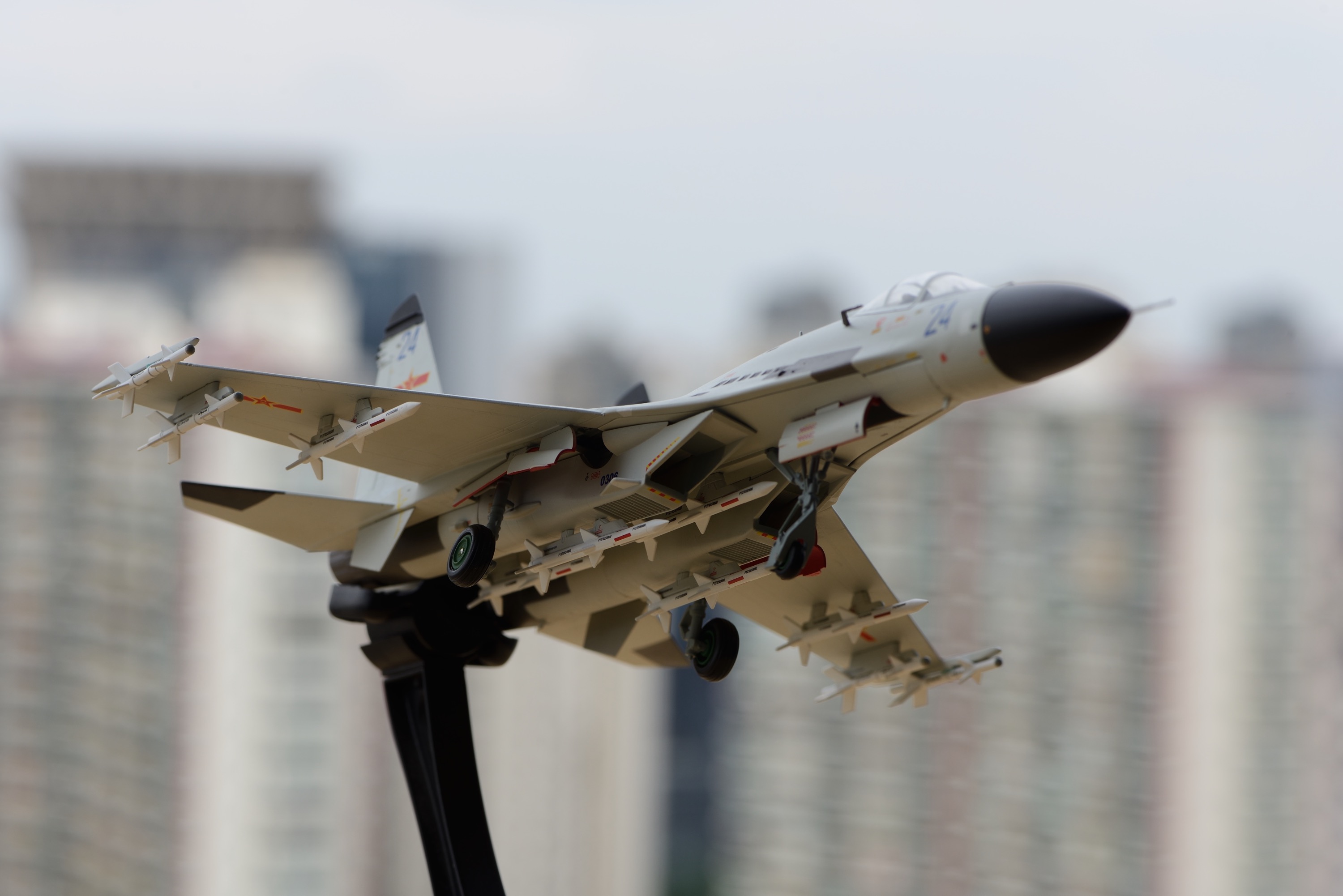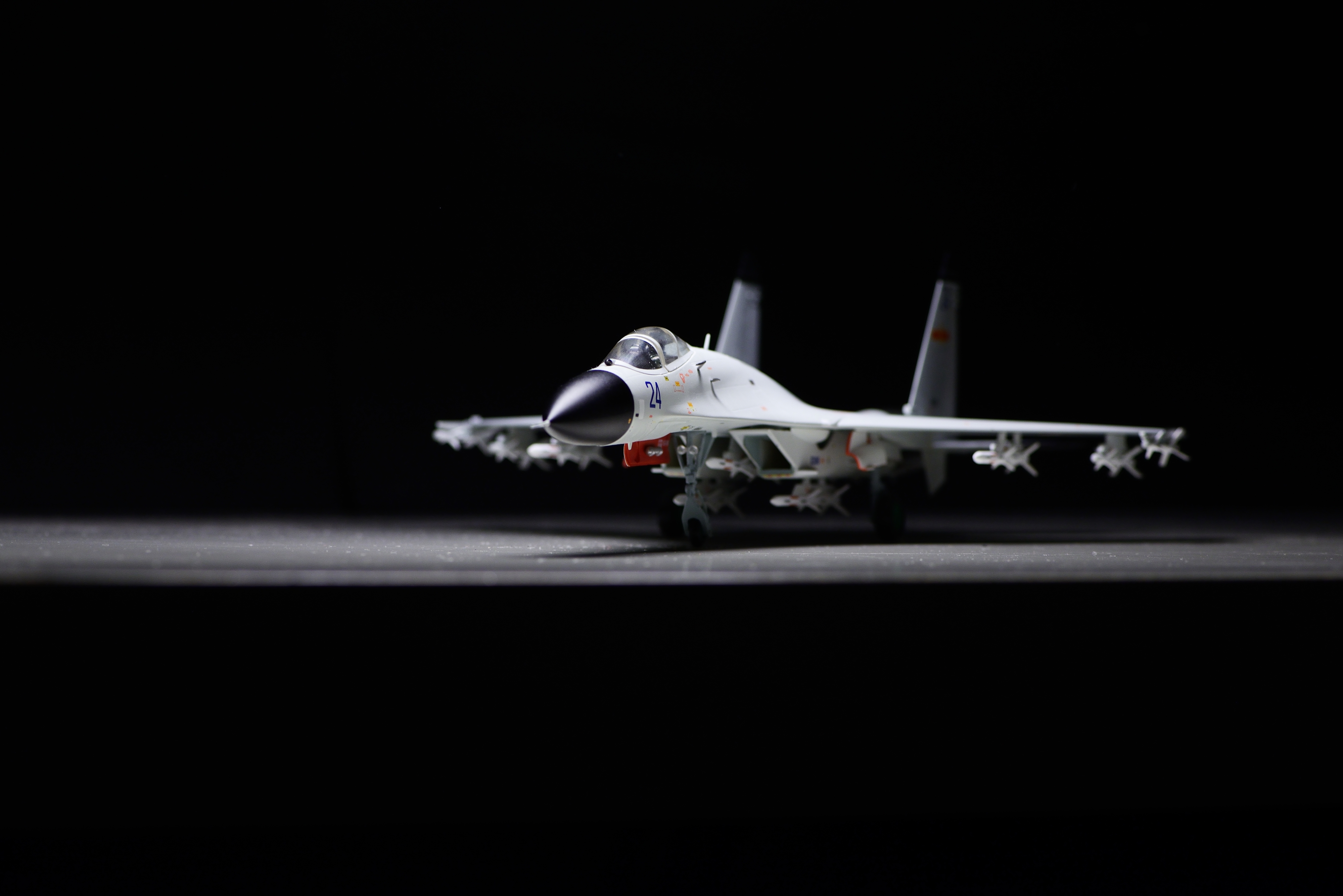 回到模型本身,JC虽然是新的涂装,但还是用了WT外型有问题的单座SU27的老模具,在大型上没做任何改动,不得不说这是个最大的遗憾。除此之外,我觉得这架J-11BH都还不错。尤其是它的涂色,基本还原实机。在不同的光照条件下,能与实机一样,显现出白色或蓝灰的色彩。模型的漆面也比较均匀,整体涂装还是挺赏心悦目的。导弹这次给的也很足,6枚霹雳12,4枚霹雳8,满挂的数量了。J-11BH的标准巡航拦截挂载是2枚霹雳12,2枚霹雳8。此外,导弹的移印也挺多,挂加上的中文移印也是别具一格,仔细看还确实有内容。另外,我感到JC这次的做工似乎比上两款更好些,舱盖的贴合度很好,前起落架装配比较仔细工整。但是,前起落架的组装却非常松,以至于我用上了蓝丁胶,否则根本装不上。总的来说,我觉得这次的J-11BH是一款功过参半的产品。最让人心里介怀的,还是它那不太准的外型。但在做工、涂色、细节等其它方面,我感到在JC中可以算得上是比较好的产品了。