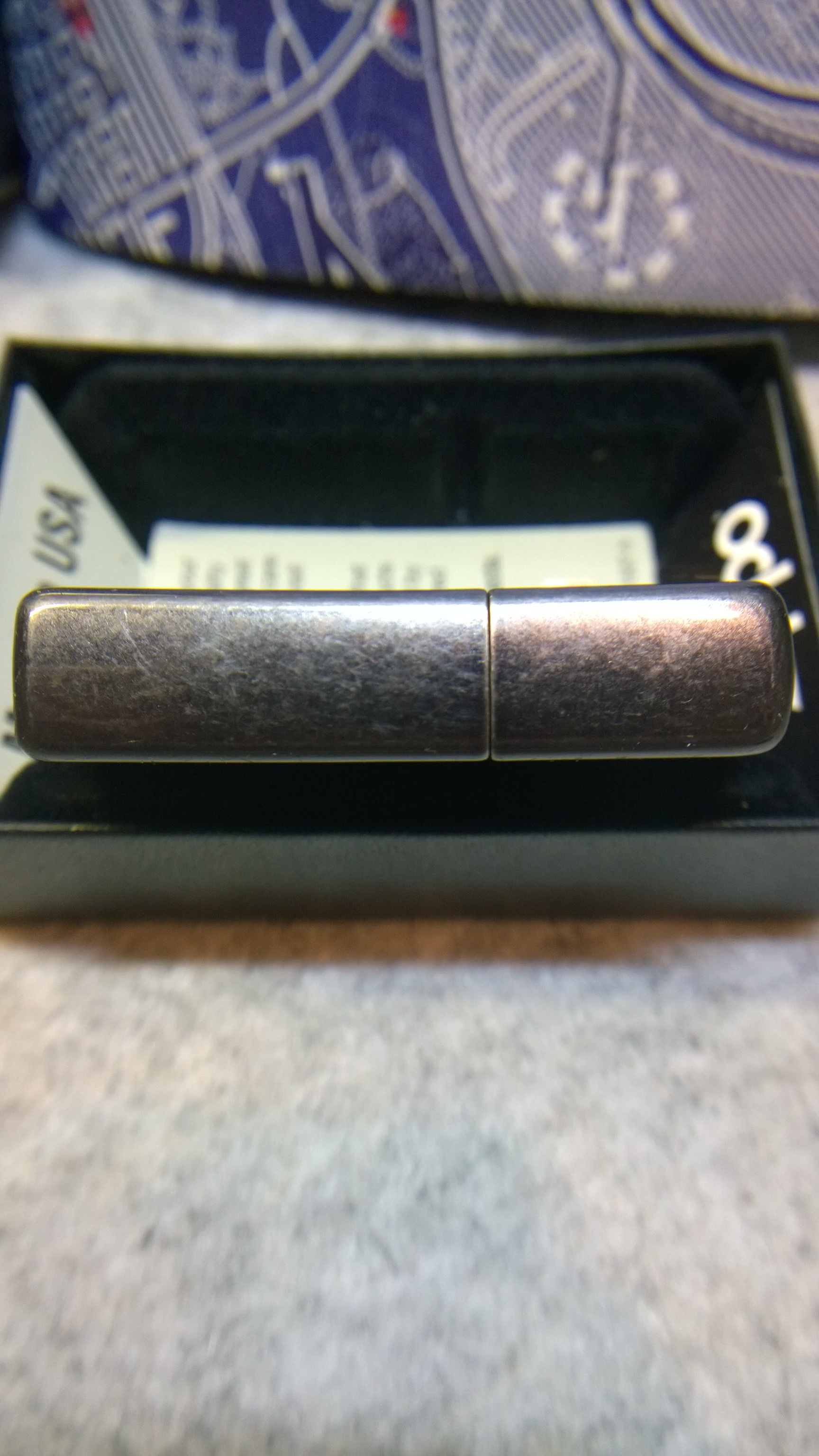 【具体描述】zippo PVD浸染乌黑,型号为28378,非黑冰,原配内胆,原盒原说。上盖能看见一个出厂瑕疵小磕,手摸不到,应该是在镀层之下了。