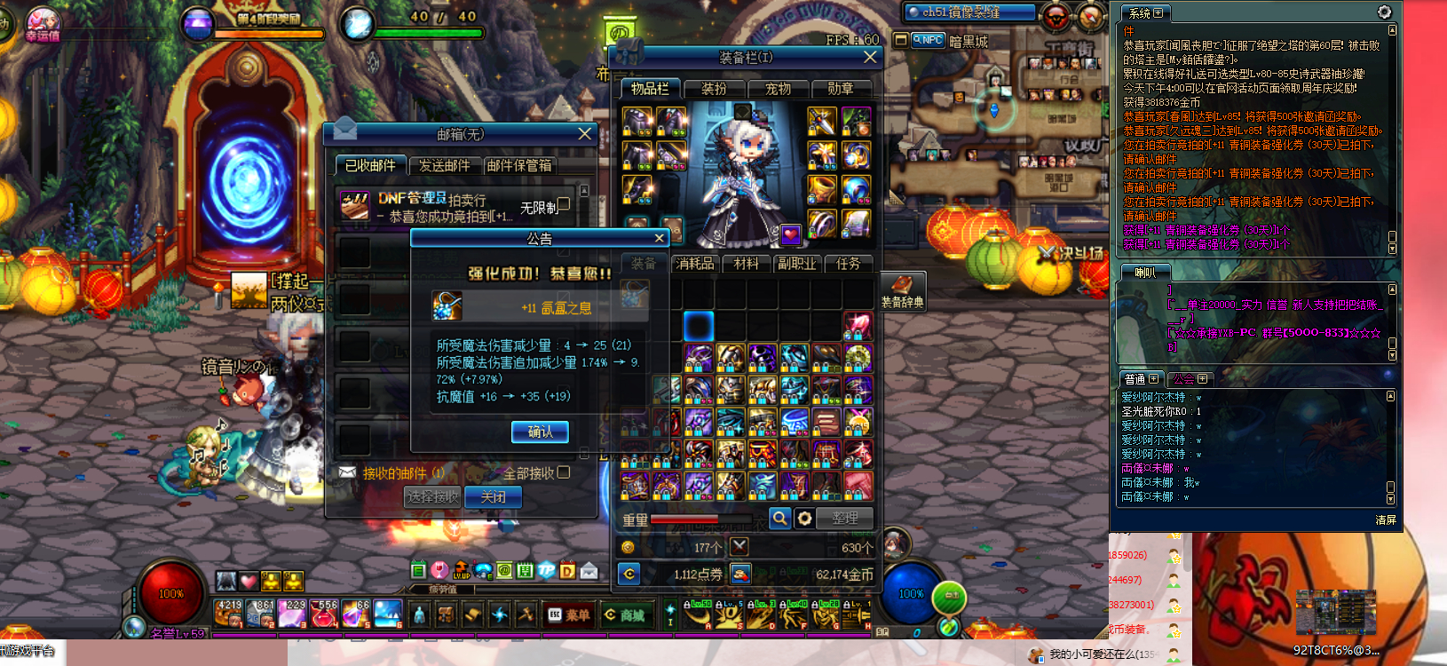 买了个6全属强先打上将就,然后把仓库里的114张挑战卖了,买了3张青铜,然后准备买200的游戏币继续硬怼,结果第二张青铜成了!成了!恐怕是这辈子dnf最欧的时候了