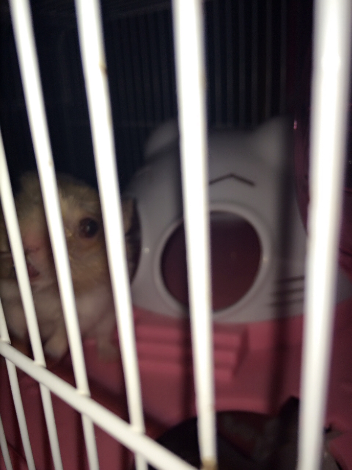 我家金丝熊现在2岁了,它的左眼眼周围突然有一圈红色,眼睛还凸起,还在流泪,有哪位好心人知道它怎么了么,我已经用盐水给他擦拭过了,还是没有什么效果,怎么办,图片是没照到它那只眼睛,宝贝现在特别没精神