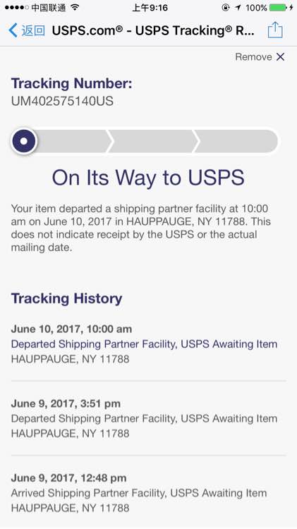 你这货好像usps还没收到吧,,on its way to usps,,虚假发货?